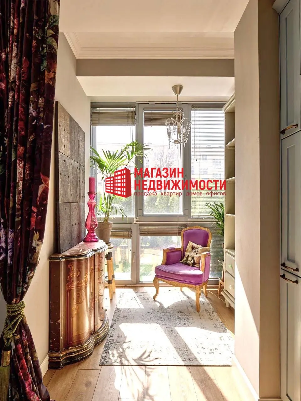 Гостиная в квартире объединена с кухней и оформлена в стилистике европейского эклектичного модерна. Кухонная зона компактная, с голубыми фасадами и итальянской техникой. Интерьер выстроен на контрасте спокойных серых и светлых тонов с яркими акцентами — фиолетовым креслом, зелёной бархатной кроватью, массивными шторами с цветочным принтом и авторским текстилем. На полу — паркетная доска, атмосферу в комнатах создают дизайнерские люстры.