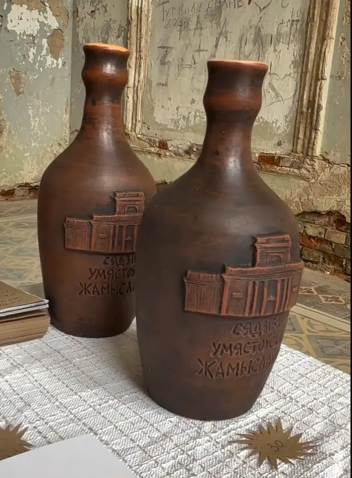Точка продажи разместилась прямо при входе во дворец. Сувенирные керамические бутылки стоят 30 руб., магниты с изображением дворца — по 10, блокноты — 7-15 руб., открытки и ручки — 5 руб., шоперы — 25 руб. Продают футболки с надписью «Жамыслаўль. Палац пад белымі крыламі», есть и брошюра «Узорны палац Умястоўскіх» про Жемыславль.