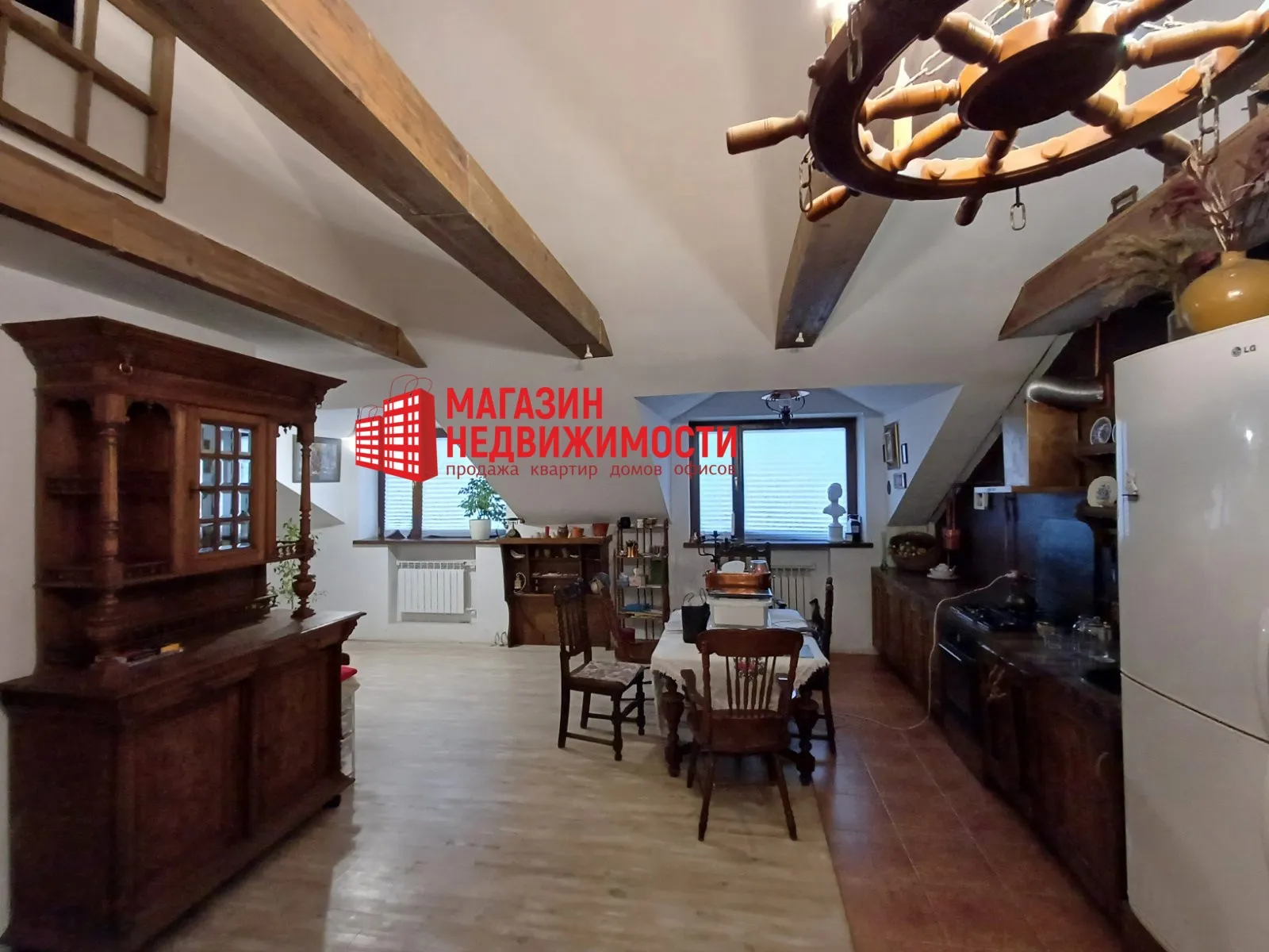 Трехкомнатная квартира свободной планировки расположена на мансардном этаже трехэтажного дома 1885 года постройки, в самом центре Гродно. Из разных окон видны не только восходы и закаты, но и сразу три костела — Фарный (святого Франтишка Ксаверия), бригитский (Благовещения Пресвятой Девы Марии) и бернардский (Обретения Святого Креста).