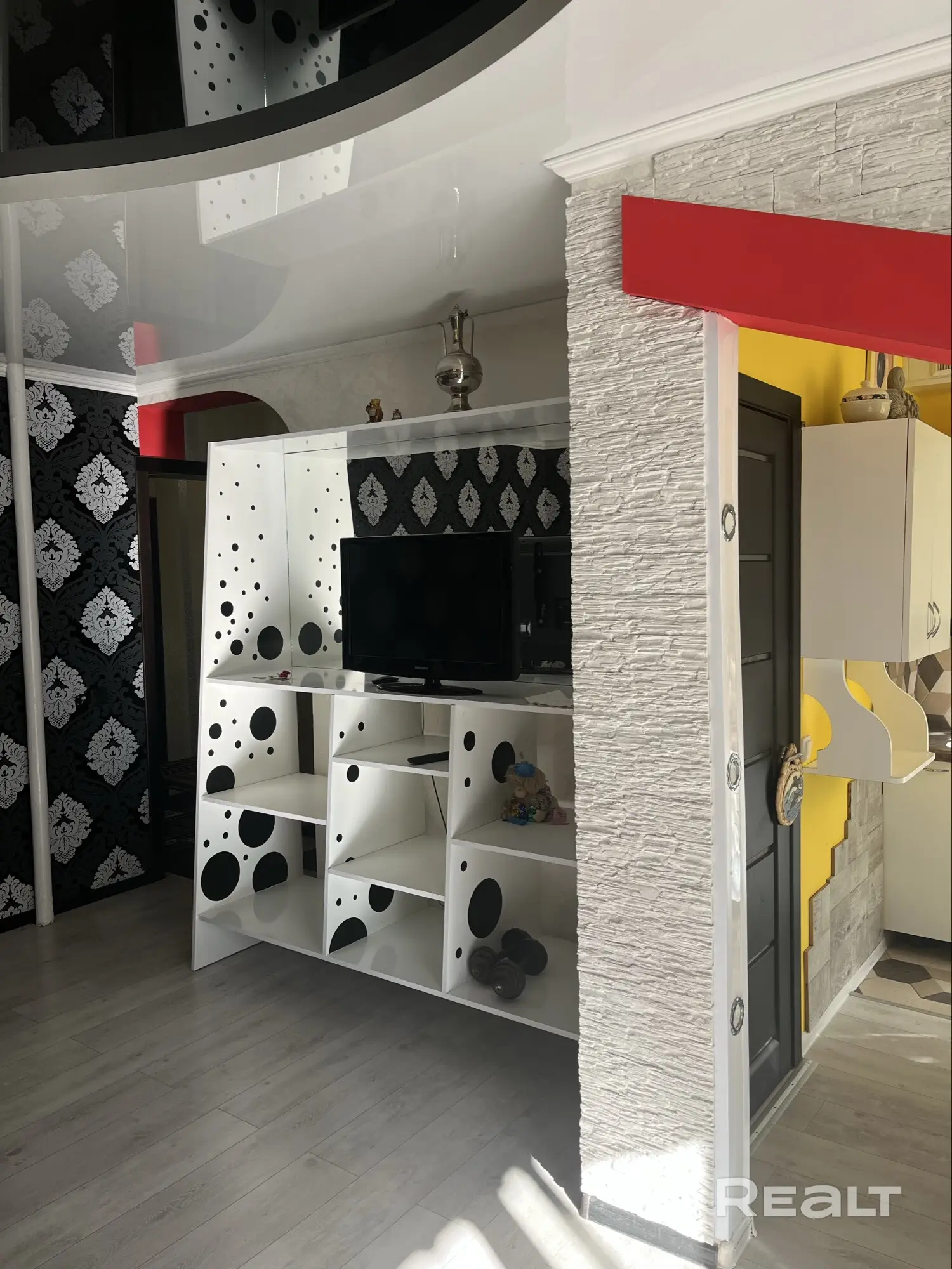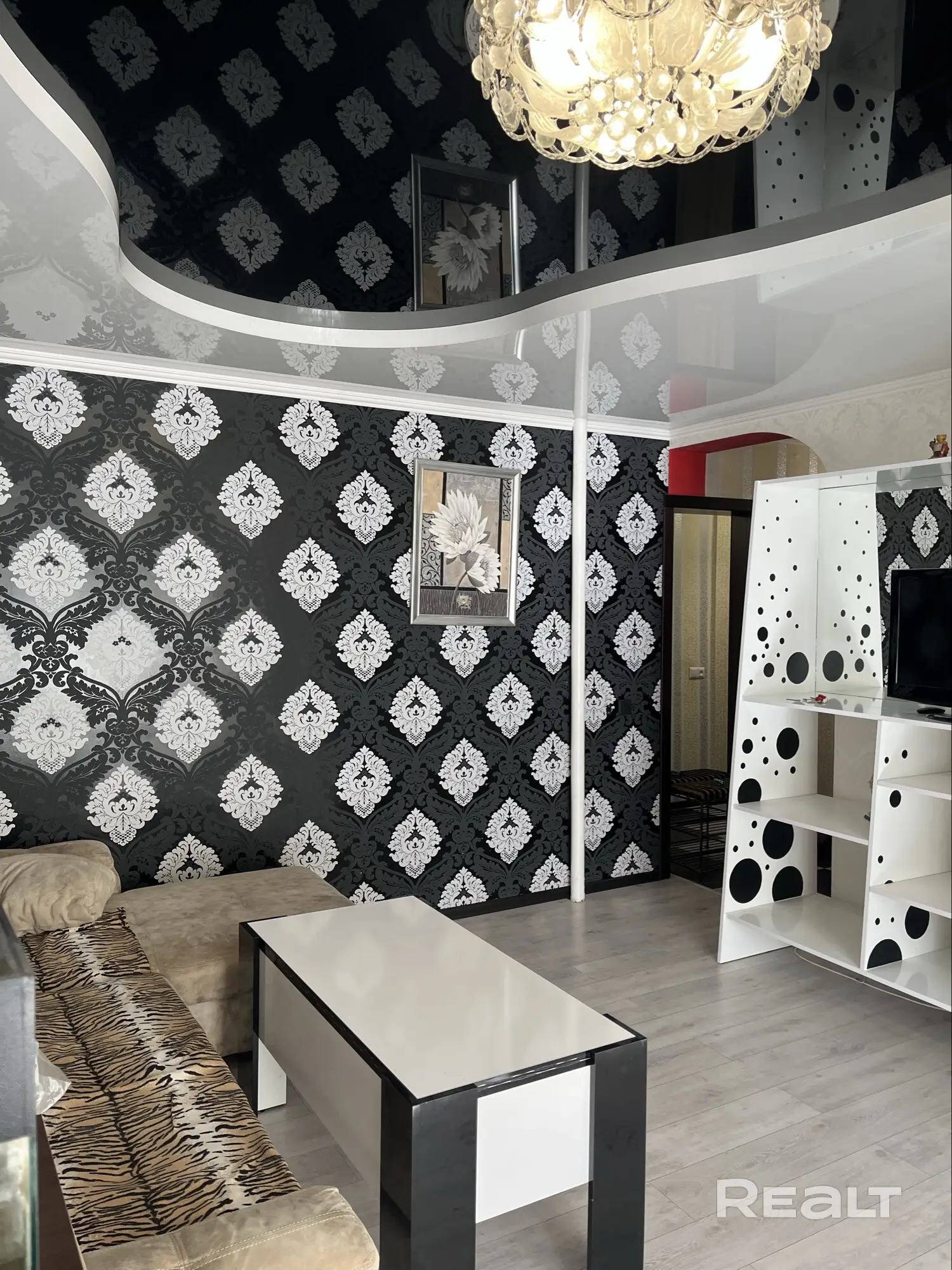 Главным акцентом квартиры стал эффектный зал с бело-черным натяжным потолком сложной формы и черными обоями с крупным классическим орнаментом. Дополняет все пышная люстра. Над несимметричной аркой из зала в кухню вставлена контрастная яркая перекладина, а на стеллаже под телевизор обыграны черные круги.