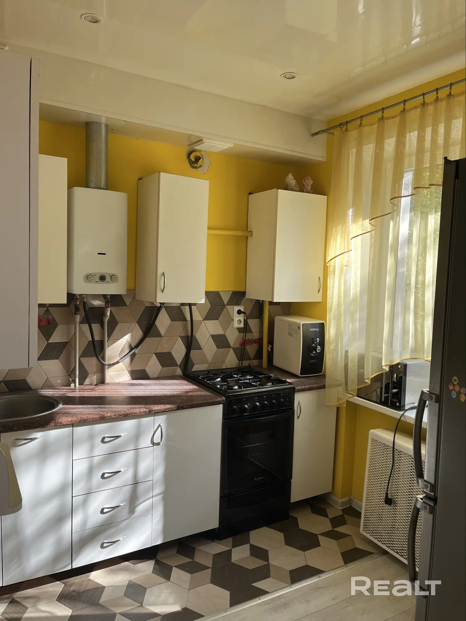 Кухня выполнена в теплых желтых и коричневых тонах с геометрическим рисунком на фартуке и полу. Установлена газовая колонка и другая необходимая техника. Санузел небольшой, совмещенный.