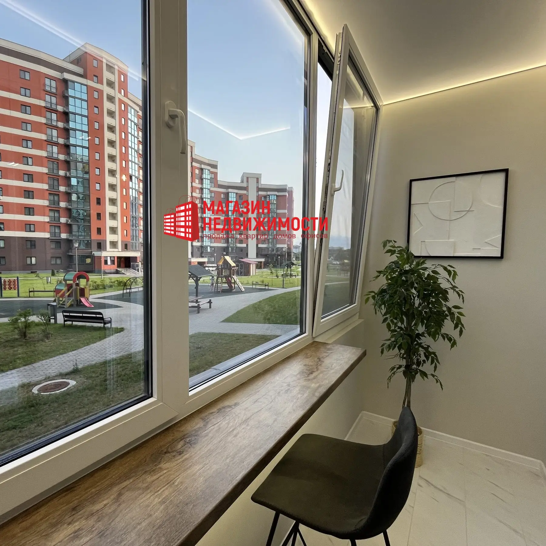 Санузел совмещённый, с большим круглым зеркалом. Душевая отделана тёмной плиткой, рядом — подвесной унитаз, умывальник и стиральная машина, есть бойлер. В прихожей установлены зеркальный шкаф и система хранения. На застеклённой лоджии установлен деревянный подоконник с функцией стола — может быть и рабочая зона, и зона отдыха. Лоджия выходит во двор с детской площадкой. За квартирой закреплен подвал.