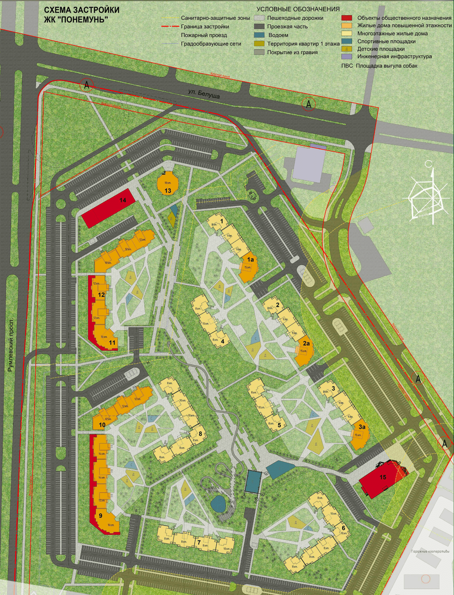 Согласно проекту, по ул. Понемуньская будут три дома переменной этажности – 15-8-10 этажей. На улице Белуша появится дом башенного типа на 18 этажей. Застройка вдоль пр. Румлевский формируется домами переменной этажности 16-12-14. На первых этажах предусмотрели встроенные общественные помещения. Всего появится 2 тыс. квартир и паркинги на более чем 2 тыс. машин.