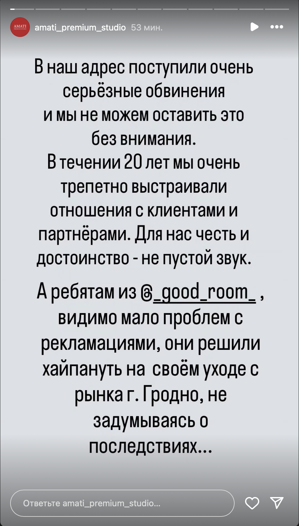 AMATI считают, что действия руководства Good Room подпадают под статью о клевете. “Также мы имеем право подать в Экономический суд Гродненской области заявление о защите чести, достоинства и деловой репутации”, – добавили в Instagram сотрудники студии.