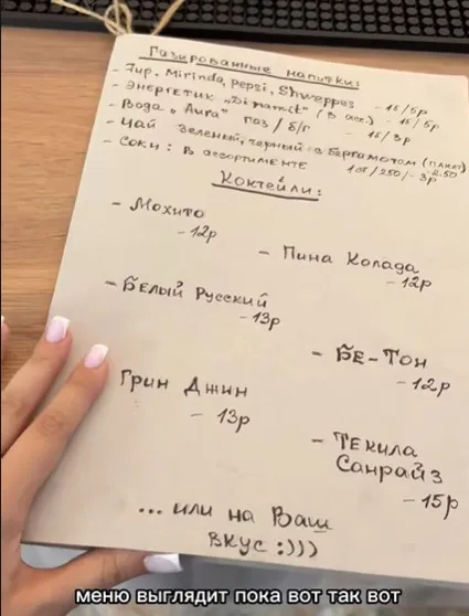 В меню есть бутылочные напитки и коктейли. Из еды чебуреки — говядина, свинина, курица, пицца и бульон. Чебурек стоит 4,5 рублей, пицца — 28-33 рубля, бульон — 3-3,5 рублей. “Дороговато, кстати”, — отмечают блогеры.