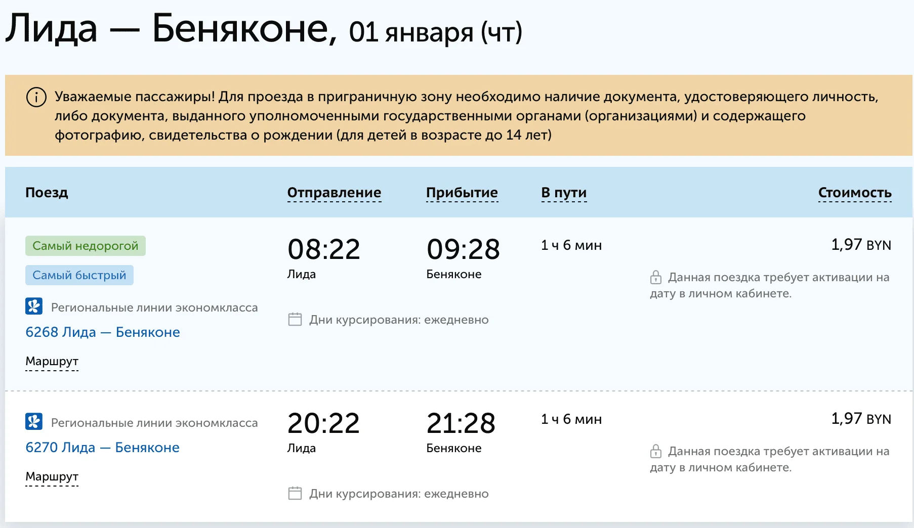 Правительство решило сохранить движение поезда в 2025 и 2026 годах. В расписании БелЖД уже есть график движения поезда на 1 января 2026. Из Лиды поезд выезжает в 08:22, в Беняконе пребывает к 09:28. Стоимость билета — 1,97 руб.