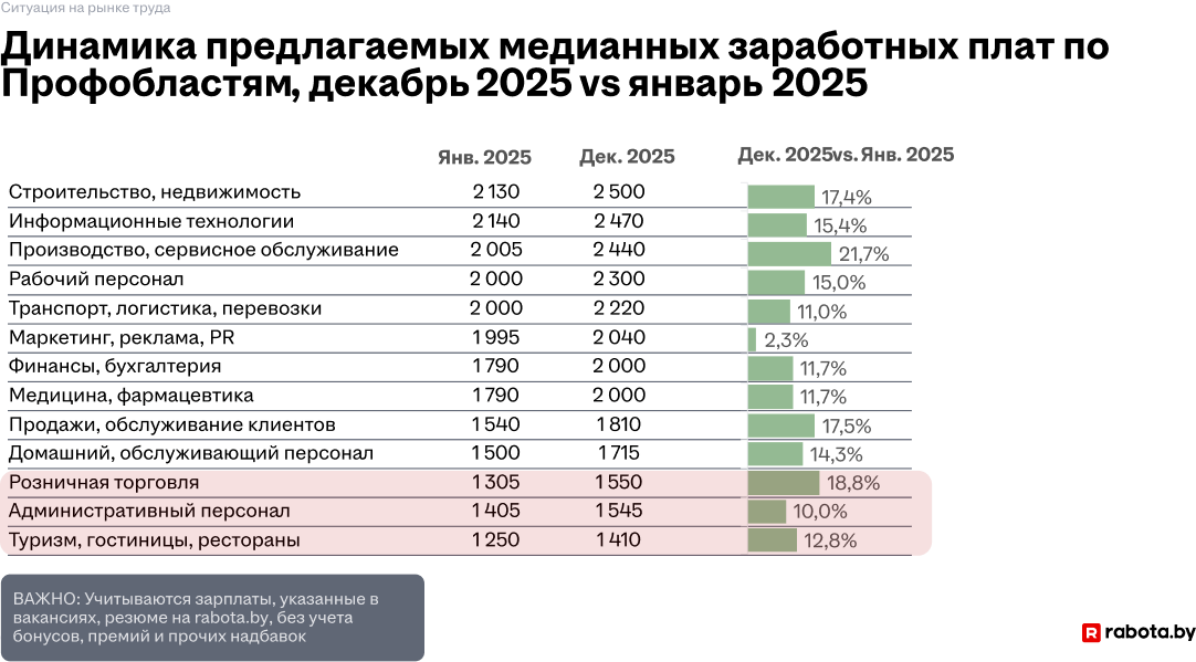 При этом в розничной торговле, а также в сферах «Туризм, гостиницы, рестораны» и «Административный персонал» медианные зарплаты, несмотря на рост, по-прежнему остаются ниже, чем в большинстве других областей.