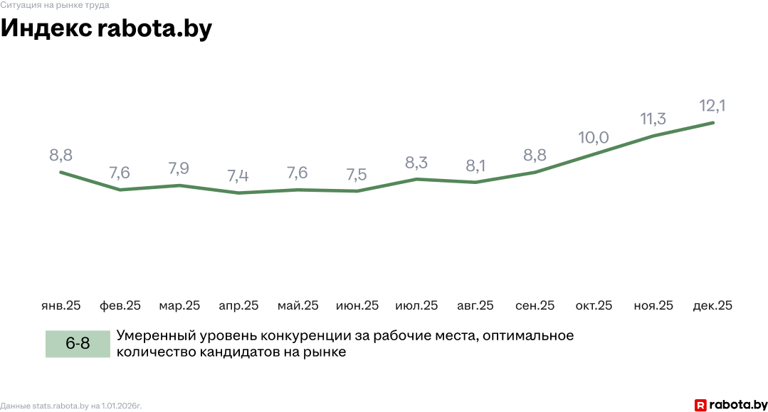 Согласно статистике сервиса Rabota.by, в начале 2025 аналитики фиксировали дефицит кадров в некоторых сферах. Но уже к концу года количество резюме выросло на 67,4%, а вакансий стало меньше.
