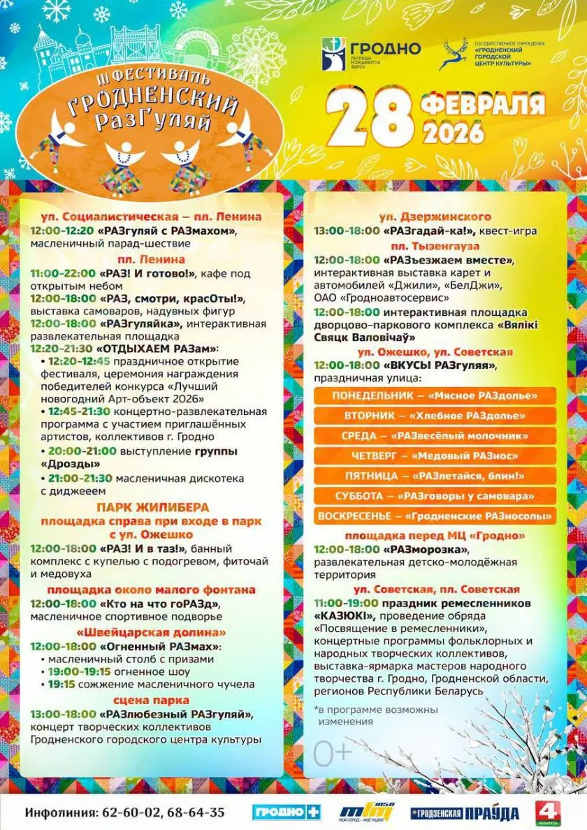 Масленичный фестиваль «Гродненский РазГуляй» отметят 22 февраля. Запланировано праздничное шествие, несколько гастрономических площадок и отдельная локация для ярмарки «Казюки». Подробную программу публикует «Гродно Плюс».