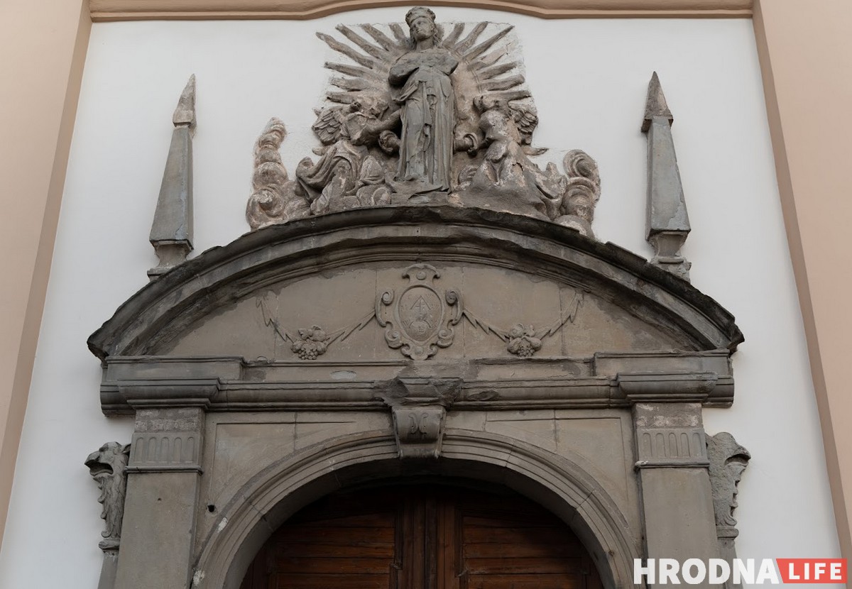 Такие входы в костёл — порталы — можно увидеть в Италии или Франции. Над входом гродненского Бригитского костёла находится фигура Марии и фрагмент Благовещения. По сторонам — грифоны с лапами льва и головой орла. Весь вход украшен фруктами — символом рая.