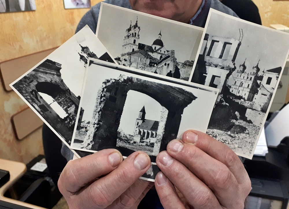 Во время Второй мировой войны была разрушена и значительная часть центра города. Для сравнения показываем снимок центра 1930-х гг. На месте большого квартала в левой части фото, ниже Фары Витовта, сегодня сквер.