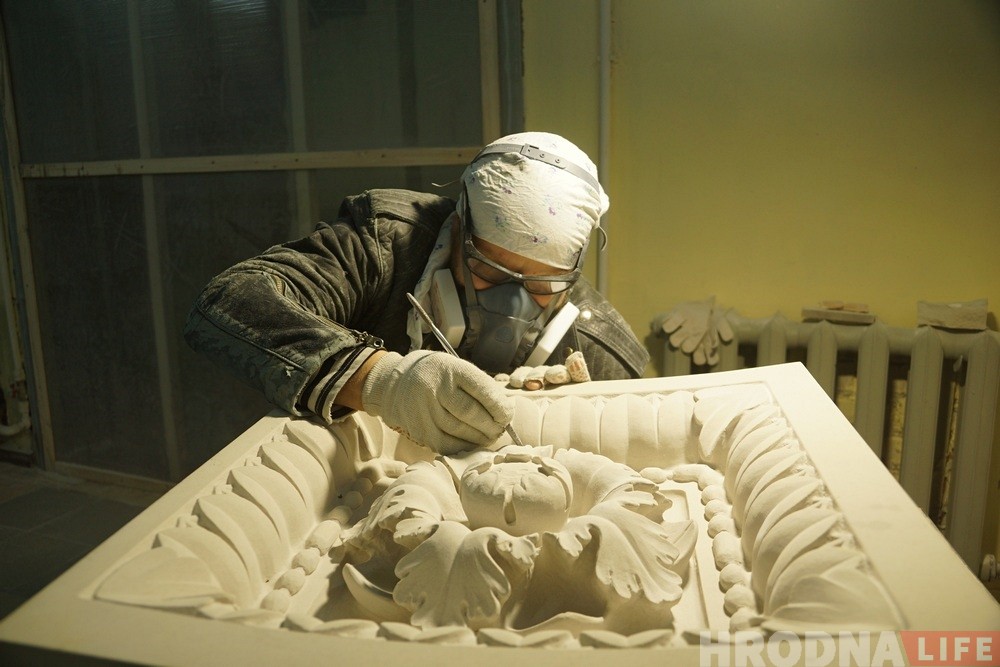 Основная задача на заводе на 2019 год — сделать скульптурно-художественные элементы на внешнюю строну замка: кессоны, маскароны, различные гербы и наружные карнизы. Их делают из привезенного из Польши песчаника.