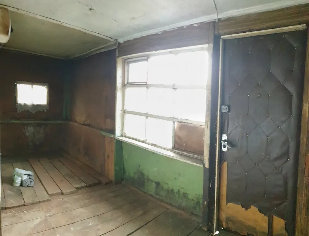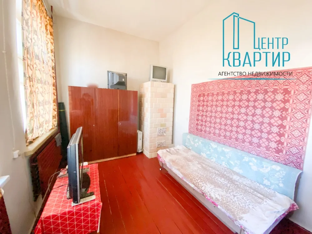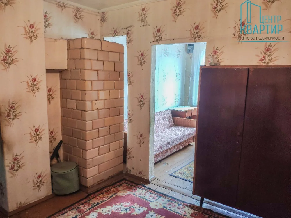 Двухкомнатная квартира 32 м² в деревянном доме 1967 года постройки с участком в 3 сотки. В доме есть вода, газовое отопление и для дополнительного обогрева — печь. Канализация — местная. Реальному покупателю обещают хороший торг.
