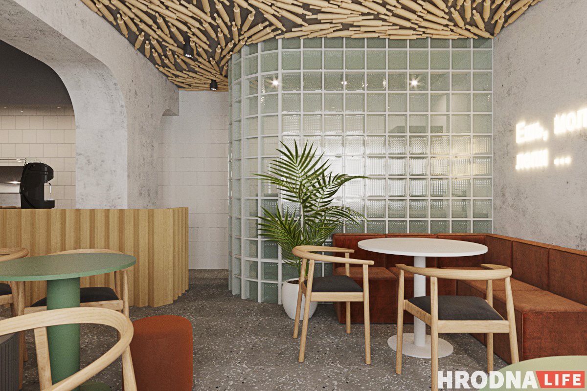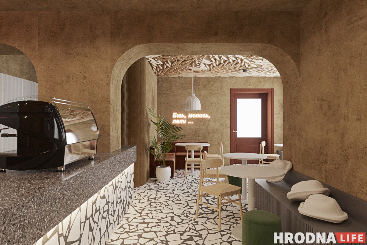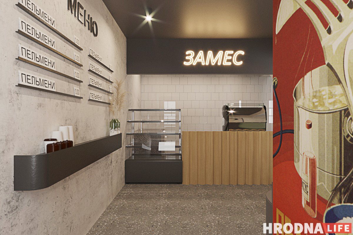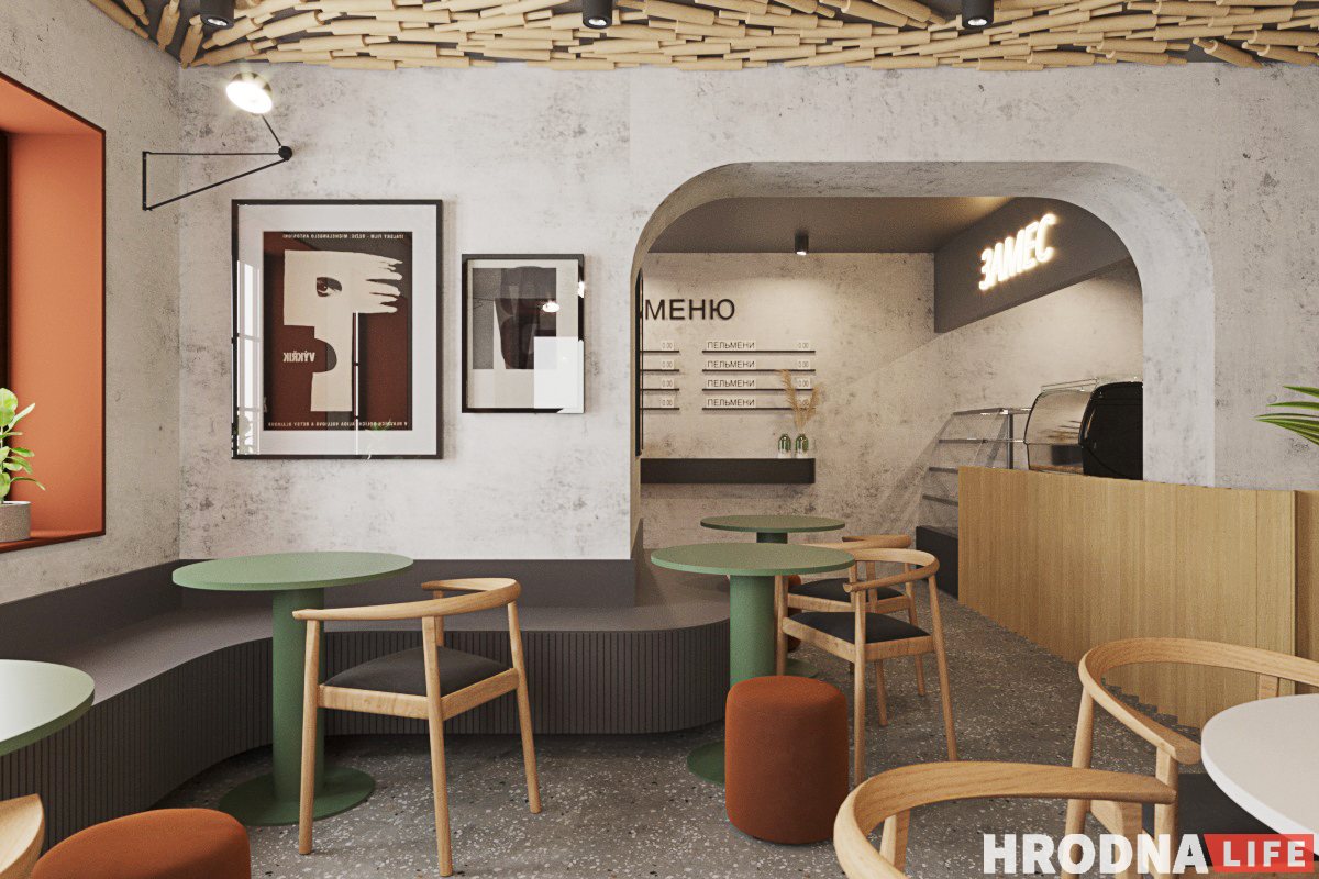 Сергей и Юлия сделали два проекта дизайна для пельменной. Первый вариант они разработали под советскую тематику и хотели, чтобы заведение выглядело похоже на хипстерскую версию советской столовой. Этот проект получился более неформальным и молодежным: стенка из стеклоблоков, пол в стиле советского “терраццо” (советские полированные бетонные полы с камешками или кусками мрамора в холлах и коридор общественных зданий — Hrodna.life), большой рисунок с пельменями на стене, советская керамическая плитка в зоне выдачи еды, надпись над барной стойкой “Замес” и надпись в зоне приём пищи «Ешь, молись, лепи…».