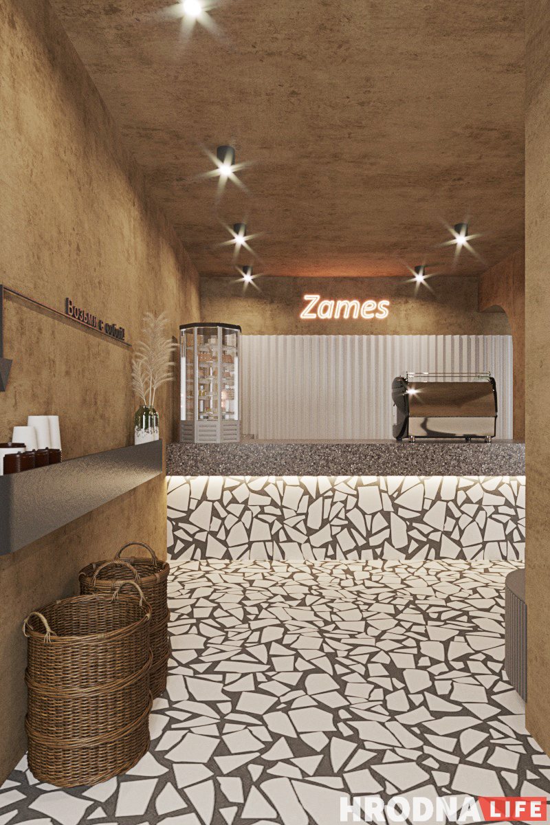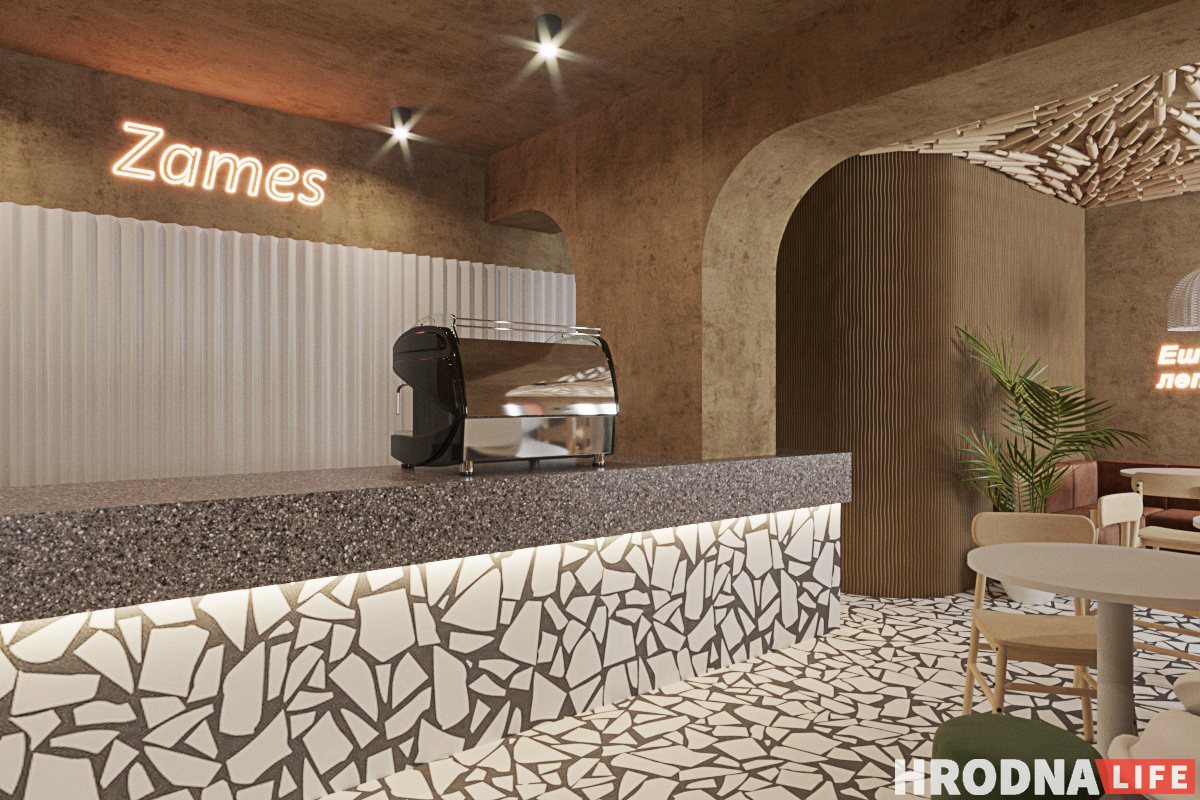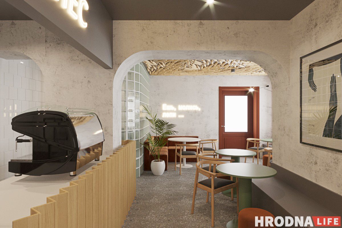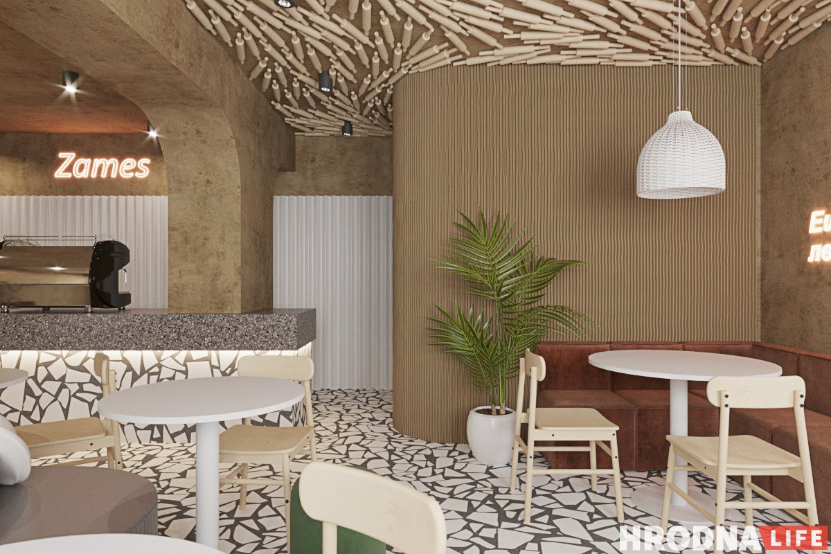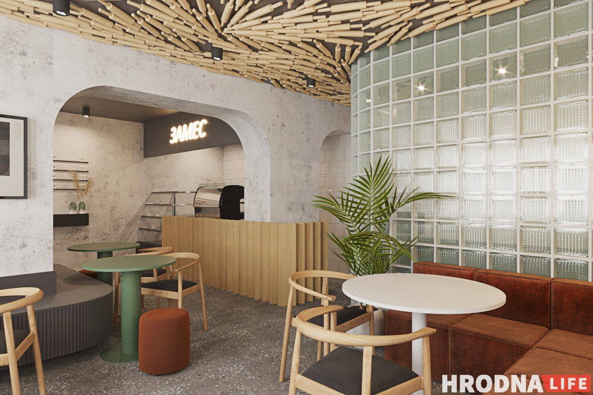 Сергей и Юлия сделали два проекта дизайна для пельменной. Первый вариант они разработали под советскую тематику и хотели, чтобы заведение выглядело похоже на хипстерскую версию советской столовой. Этот проект получился более неформальным и молодежным: стенка из стеклоблоков, пол в стиле советского “терраццо” (советские полированные бетонные полы с камешками или кусками мрамора в холлах и коридор общественных зданий — Hrodna.life), большой рисунок с пельменями на стене, советская керамическая плитка в зоне выдачи еды, надпись над барной стойкой “Замес” и надпись в зоне приём пищи «Ешь, молись, лепи…».