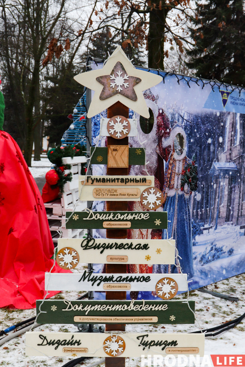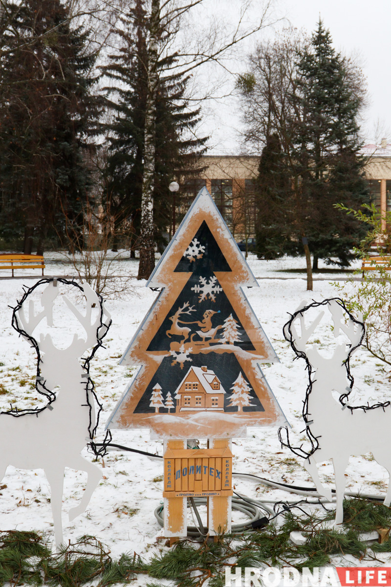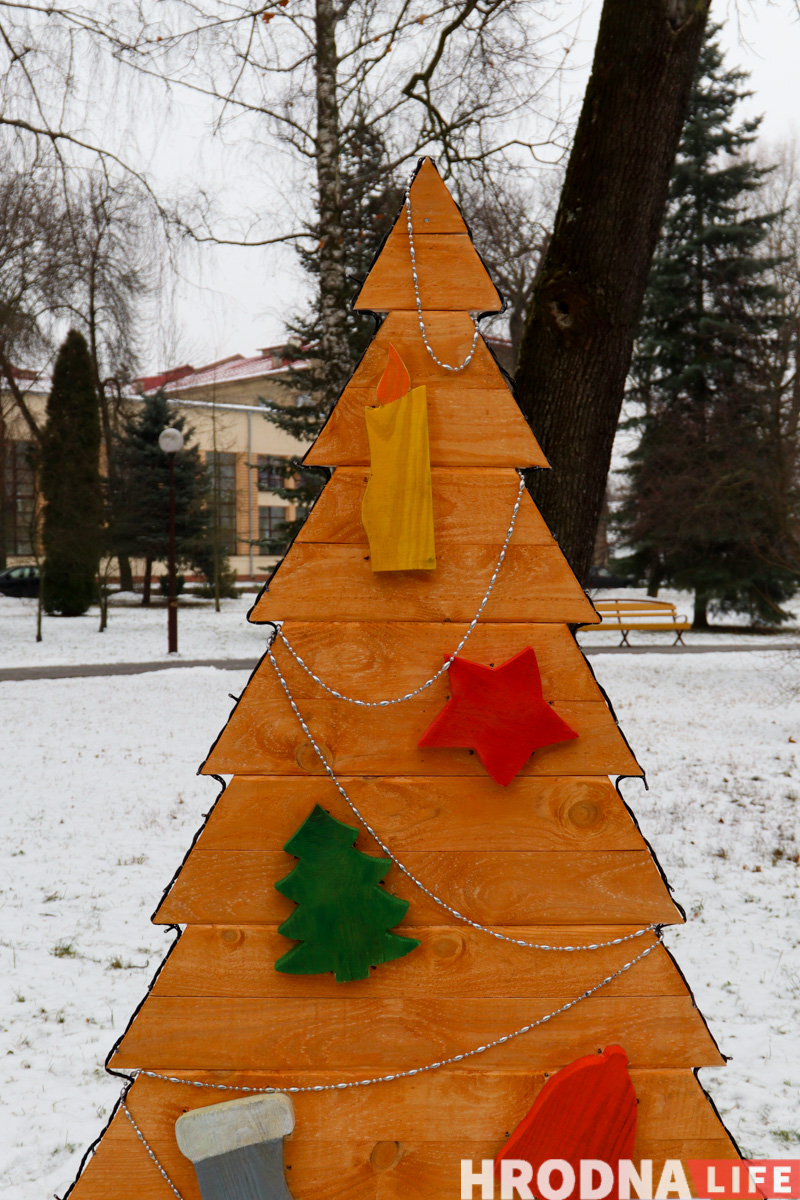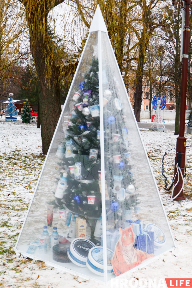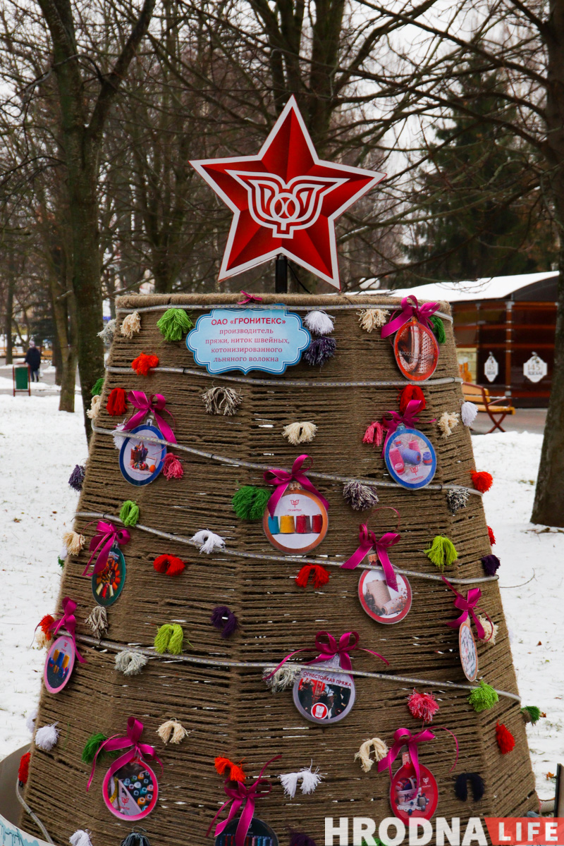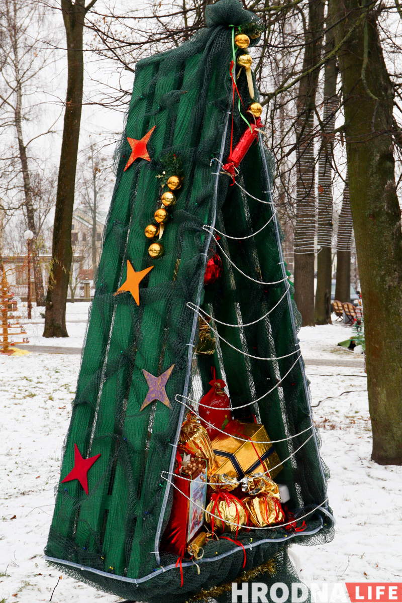 Далее по парку расставлены елки всех видов конструкций — деревянные конусы, конусы стеклянные с начинкой-продукцией, полноценные фотозоны и, конечно, затеняющая сетка. Свои елки подготовили гродненские колледжи и другие учреждения образования.