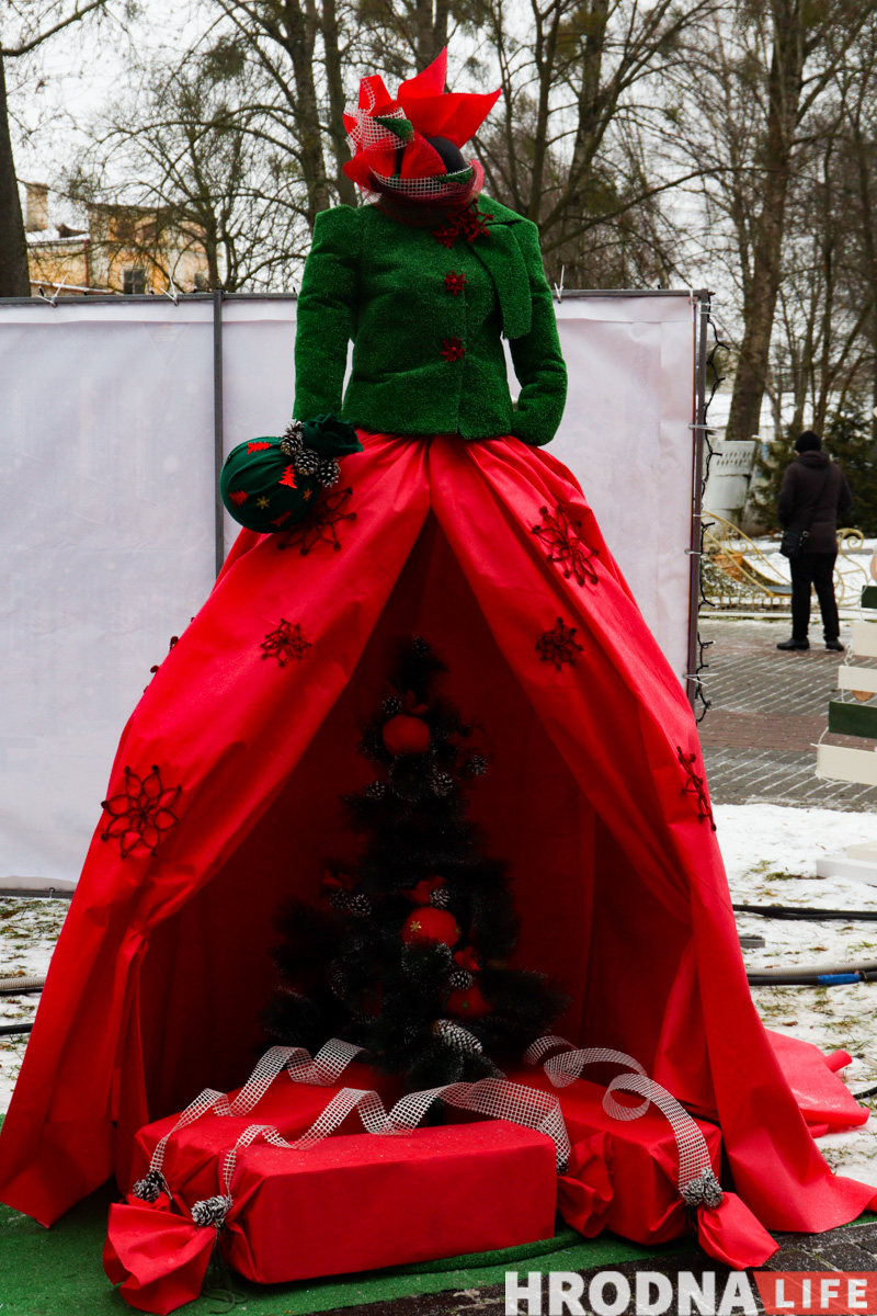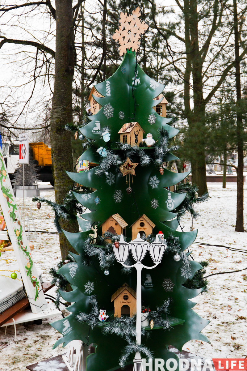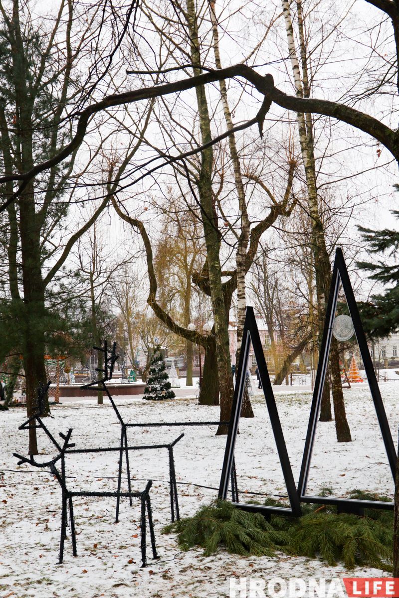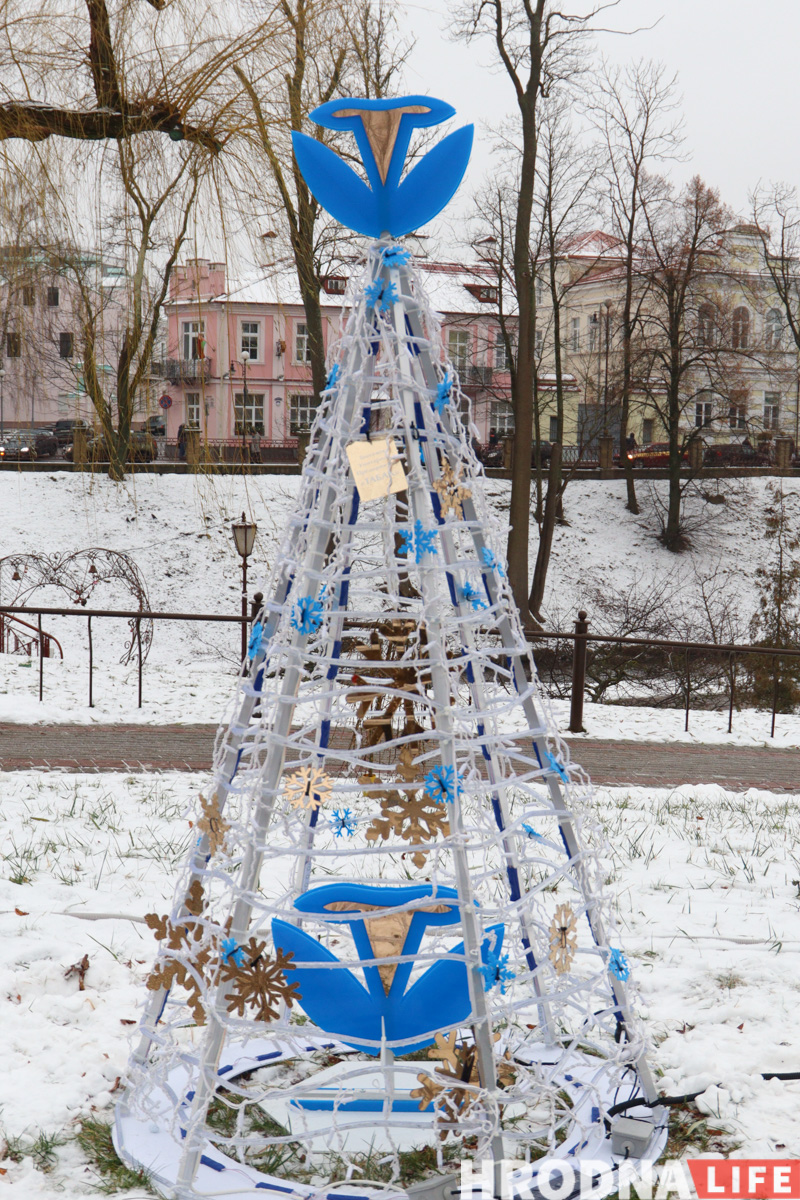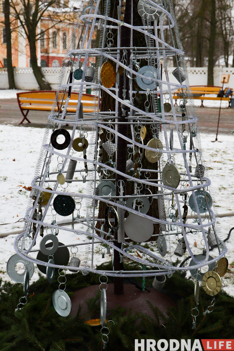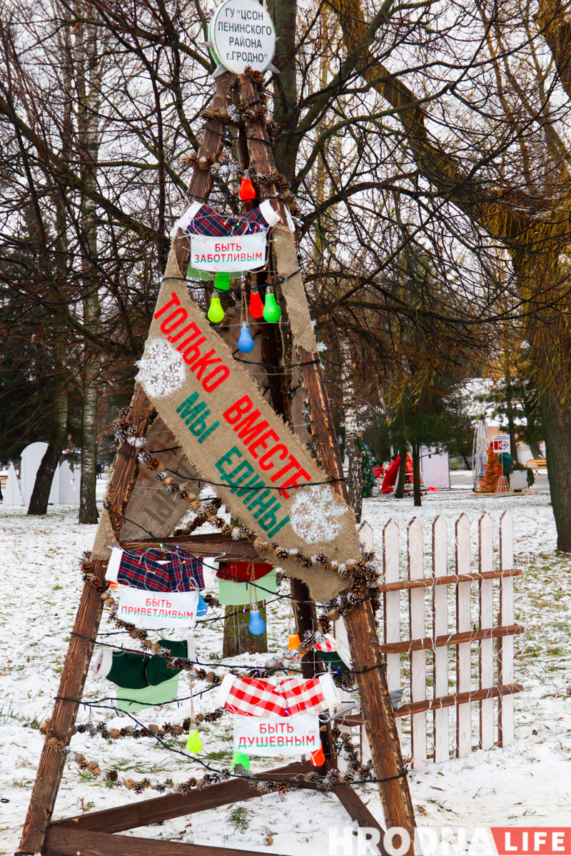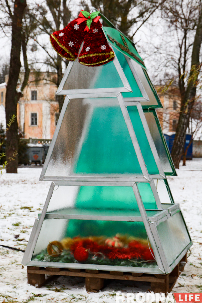 Далее по парку расставлены елки всех видов конструкций — деревянные конусы, конусы стеклянные с начинкой-продукцией, полноценные фотозоны и, конечно, затеняющая сетка. Свои елки подготовили гродненские колледжи и другие учреждения образования.