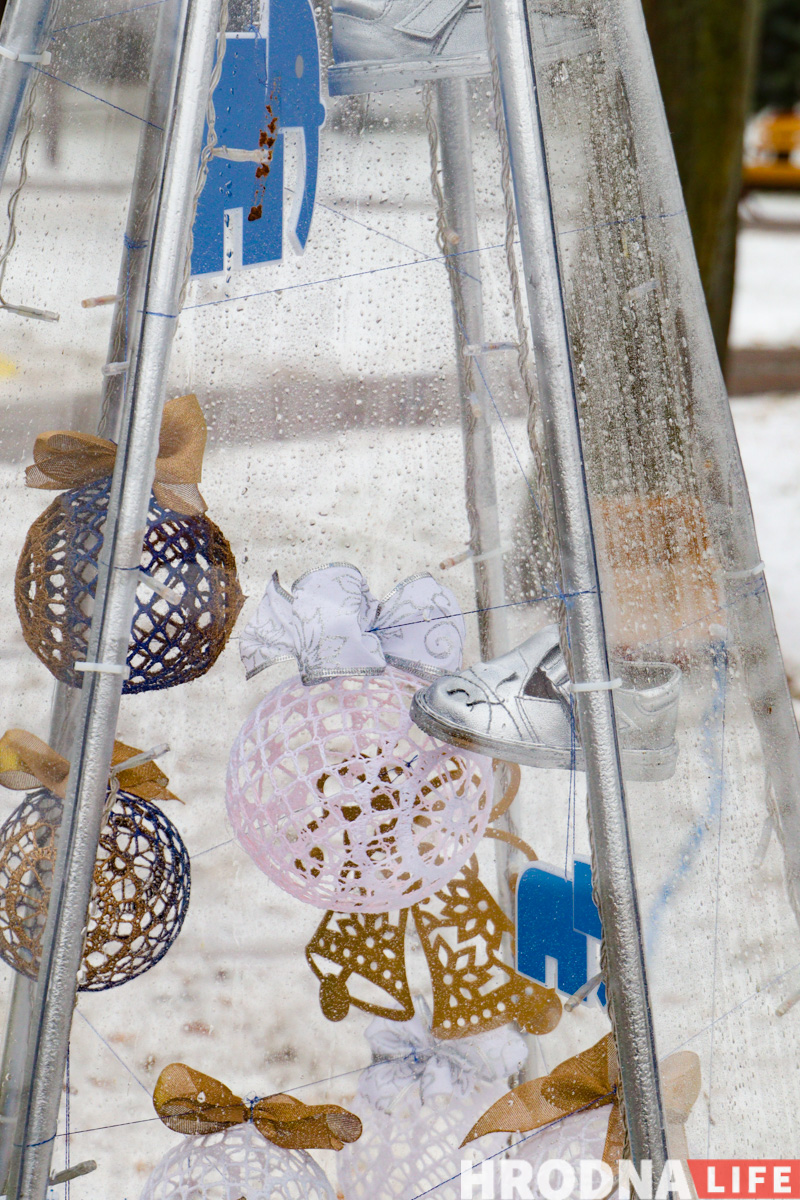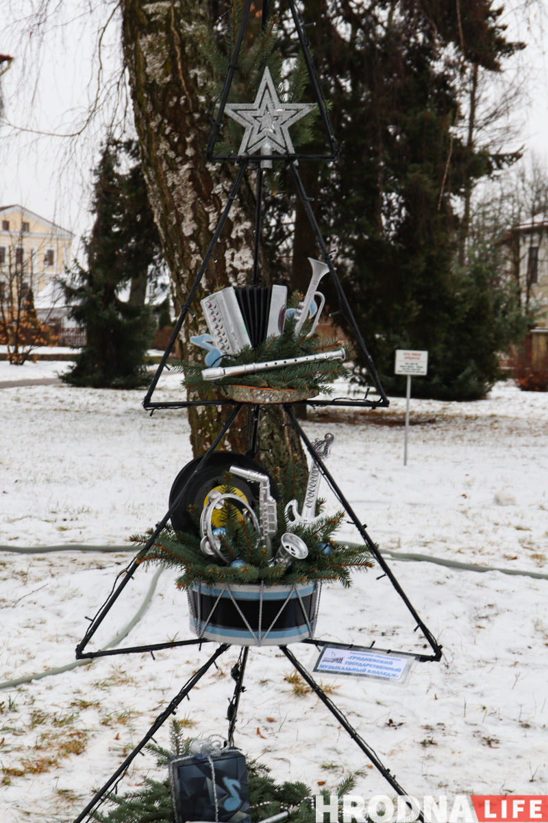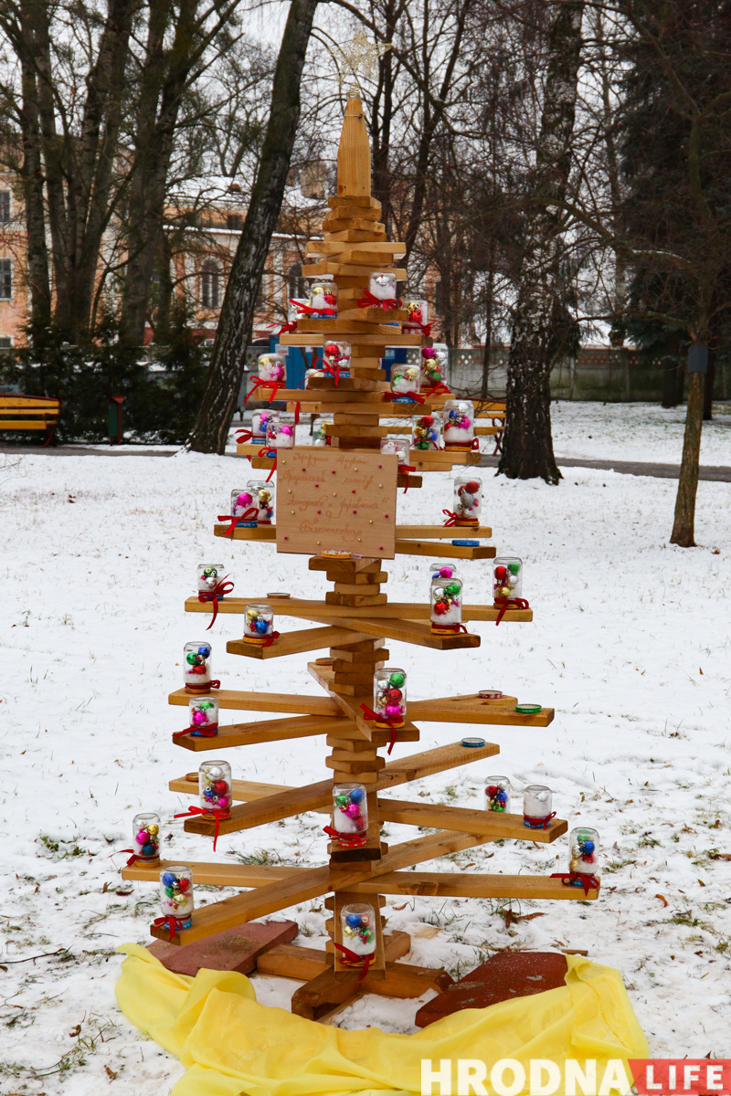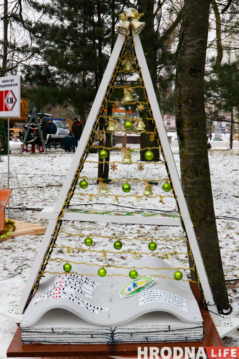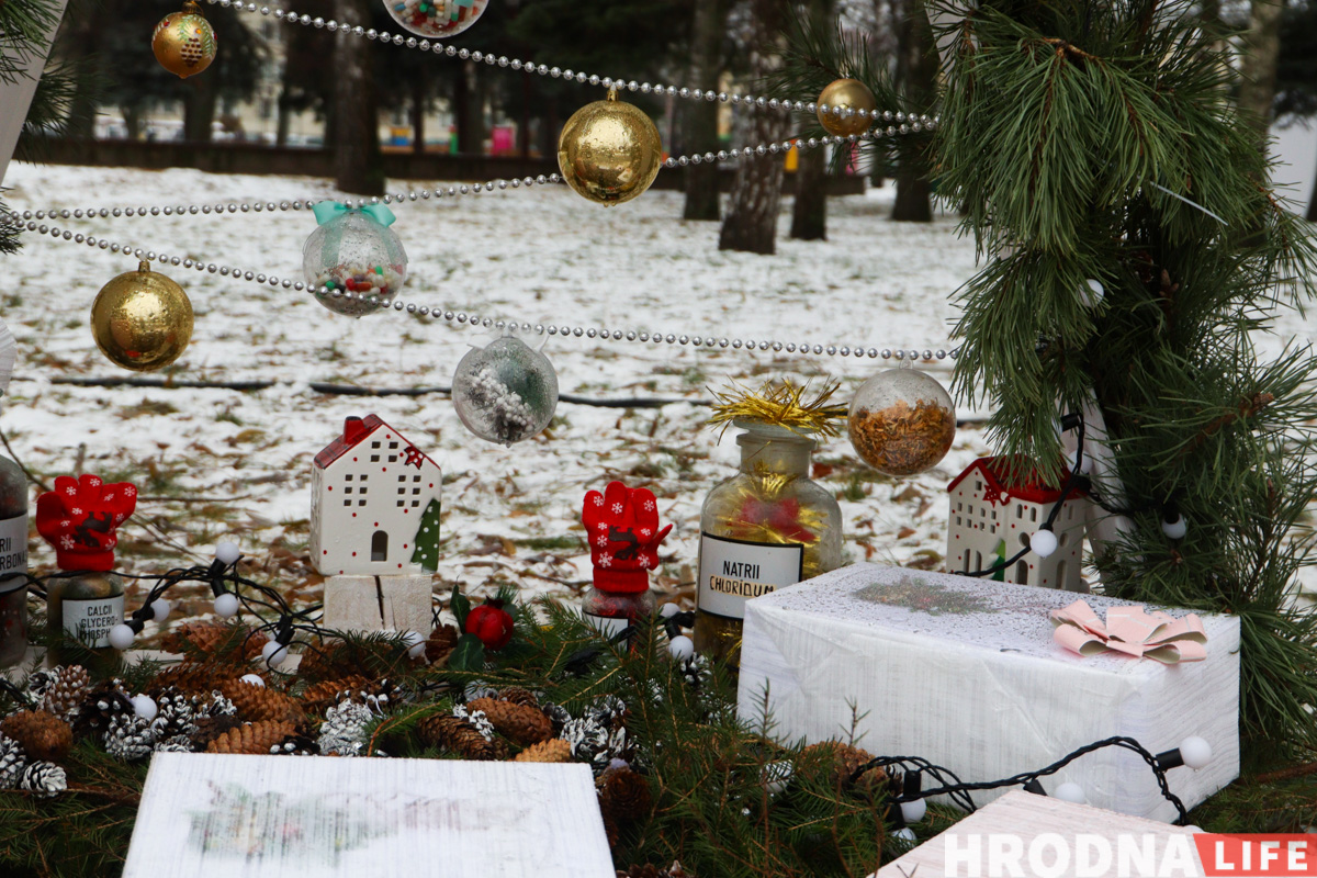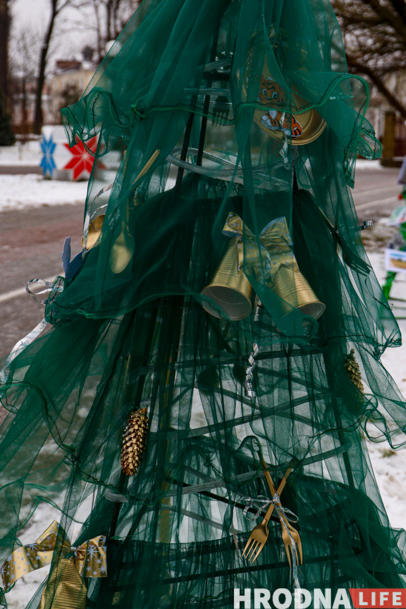 Далее по парку расставлены елки всех видов конструкций — деревянные конусы, конусы стеклянные с начинкой-продукцией, полноценные фотозоны и, конечно, затеняющая сетка. Свои елки подготовили гродненские колледжи и другие учреждения образования.
