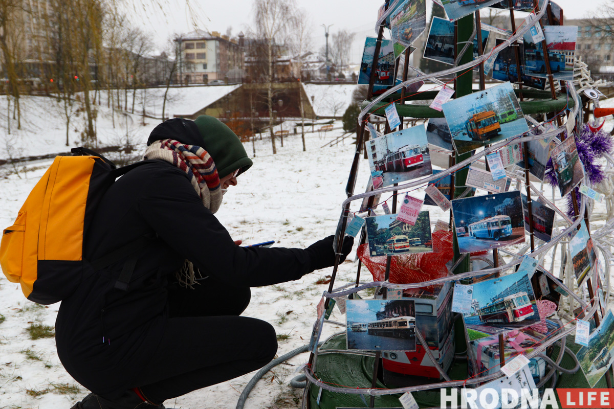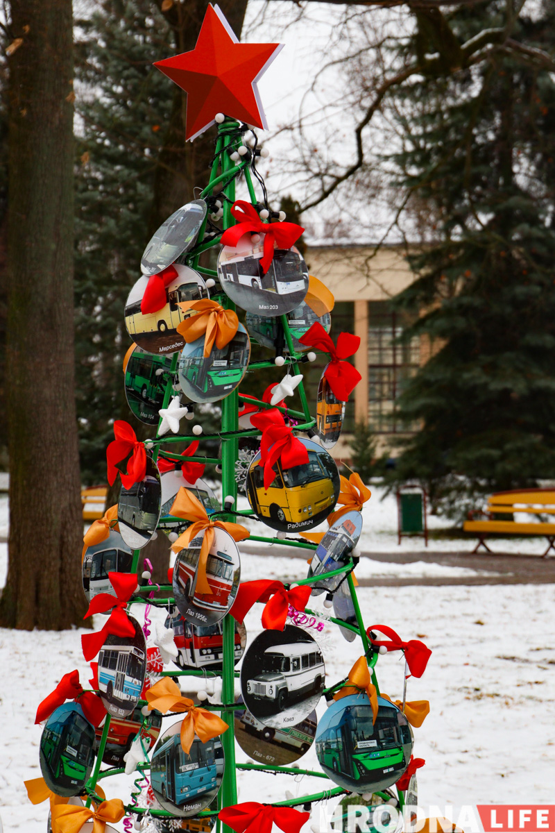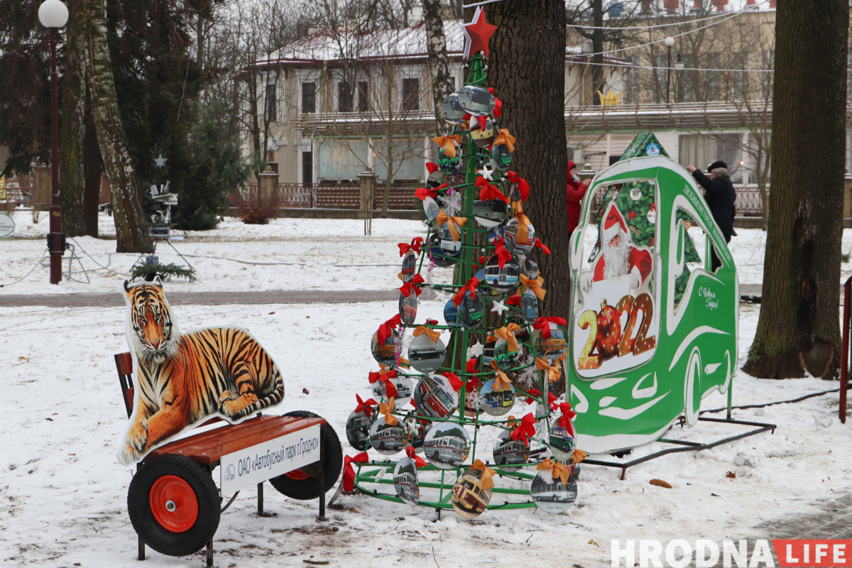 Транспортников представляют фотозона с тигром и эко-автобусом от автобусного парка и елка-остановка от троллейбусного. Троллейбусную елку стоит поразглядывать: она увешена талончиками и проездными за разные года (можно поностальгировать о ценах) из Гродно и Польши.
