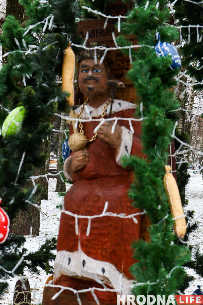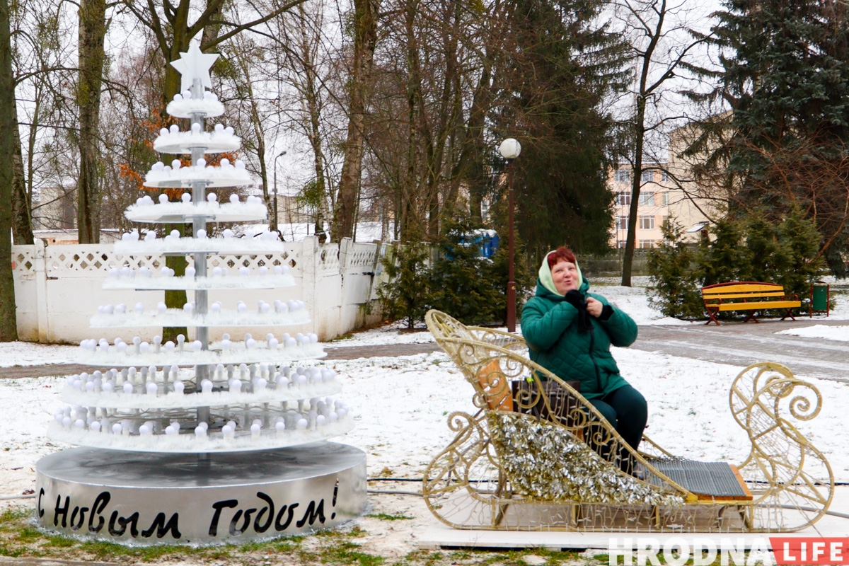 Инсталляции только появились, а гродненцы уже оценивают фотозоны. На входе в парк встречают елка «Гродно-Азот» и снеговик «Химволокно» из обмотанного ватой каркаса.