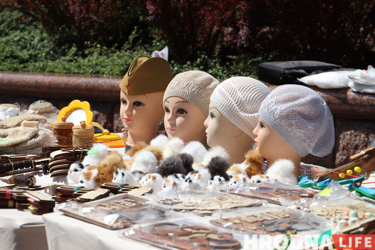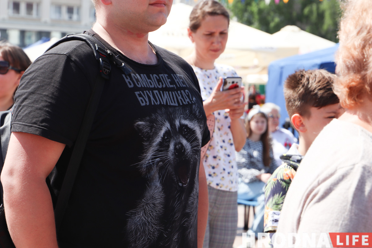 Дальше в парке развернулась торговля и разнообразные развлечения. За зданием театра записывали в кружки по интересам, установили фотозону с матрешками. Отдельную зону напротив театра кукол занял гродненский зоопарк. Среди предложений — прогулка на пони и фото со змеей, можно было посмотреть на птиц в клетках и погладить кроликов. Около вечного огня представители НОД (Национально-освободительное движение — российское националистическое политическое объединение, которое хочет возродить СССР) раздавали прохожим свои газеты.