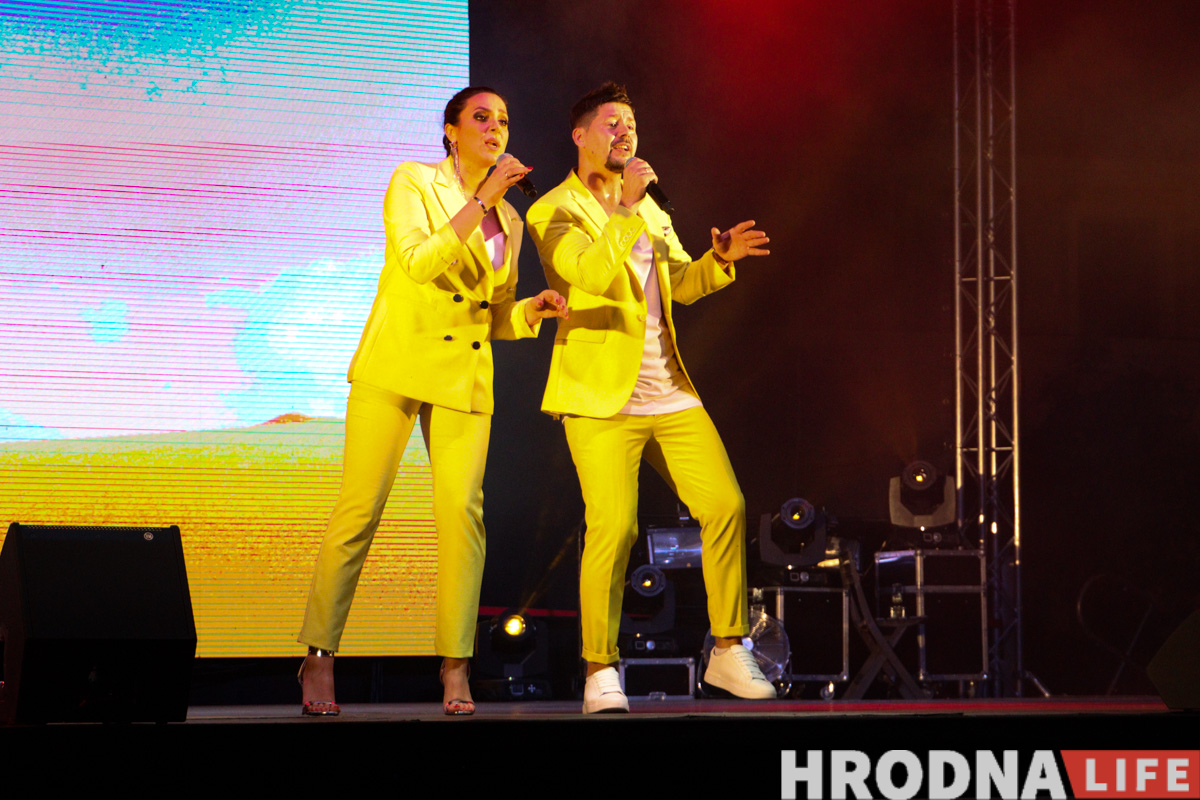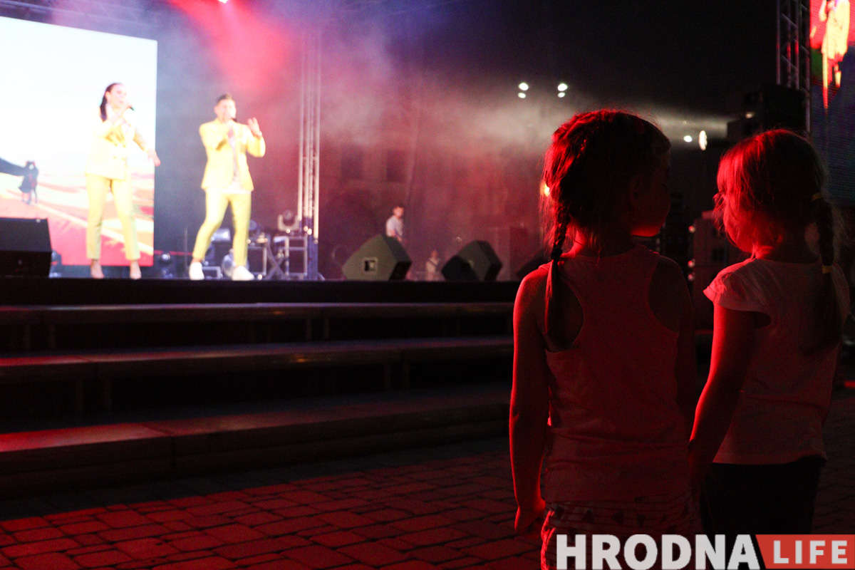 Людей в районе площади Ленина и в зрительской зоне стало заметно больше. Преимущественно это была молодежь, были и семьи с детьми. На пропускных пунктах милиционеров в праздничных рубашках сменил гродненский ОМОН. После салюта на главной сцене началось выступление дуэта Тео (Юрий Ващук, представитель Беларуси на «Евровидении»-2014) и Ольги Рыжиковой. Во время концерта на горисполком проецировали уже абстрактные и геометрические фигуры лазерного шоу.
