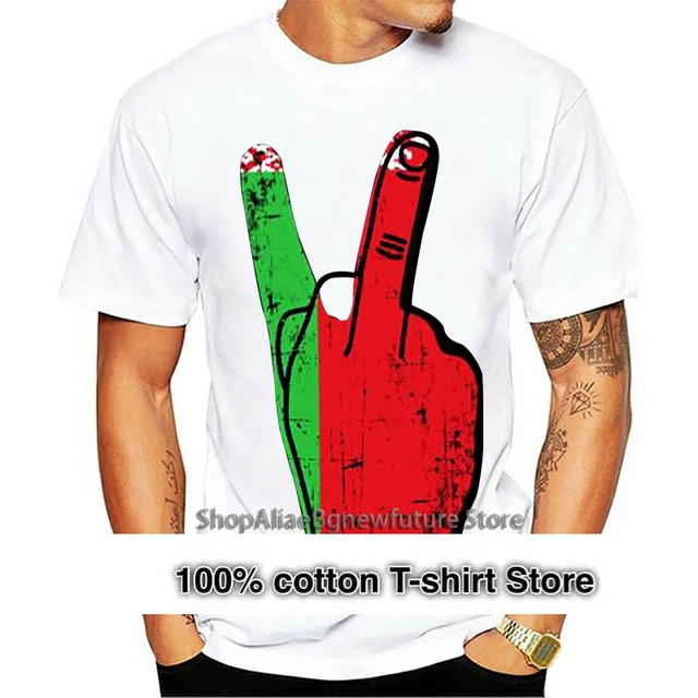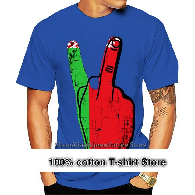 Футболка с рукой, которая показывает то ли «викторию» — символ победы, то ли вульгарный жест в виде среднего пальца. Рука окрашена в красный и зеленый цвета, а на кончиках пальцев даже есть фрагмент орнамента с государственного флага Беларуси. На выбор футболки разных цветов – они могут быть даже розовыми.