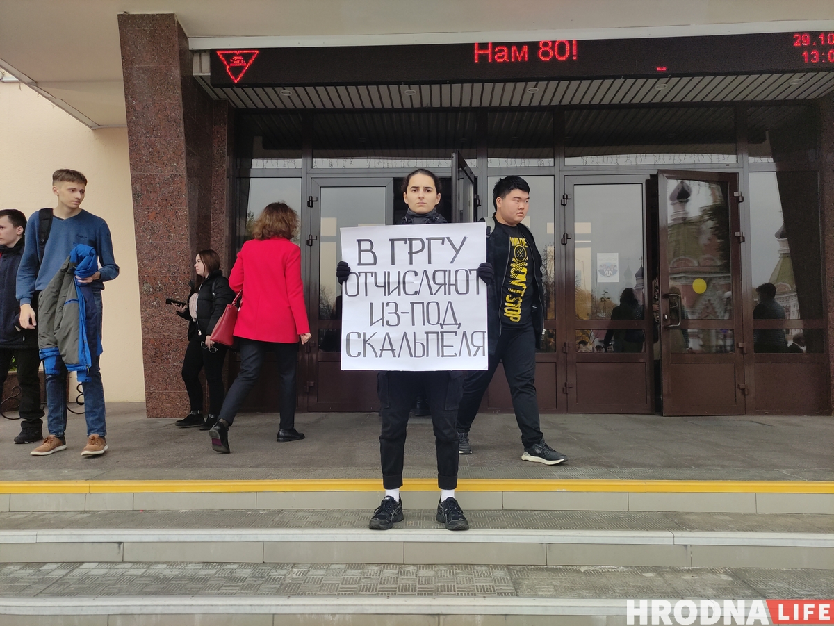29 октября сотрудники милиции задержали бывшую студентку Варвару Гринюк во время одиночного пикета с плакатом “В ГрГУ отчисляют из-под скальпеля”. Студентку Факультета искусств и дизайна Гродненского государственного университета имени Янки Купалы отчислили 14 октября 2020 года за пропуски. В этот день она легла на операцию, к которой готовилась в течение месяца. У девушки есть медицинские справки с 17 сентября, но показать их администрации она не успела.