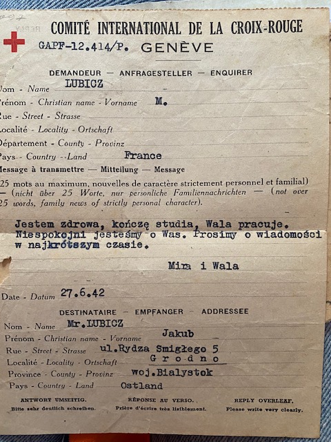 Мирослава Любич и ее брат Валь в 1938 году уехали из Гродно учиться во Францию. Оні вели переписку с родителями до июня 1941 года. После этого связь с родными оборвалась.