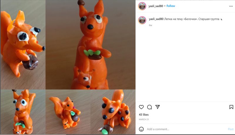 Белорусские флаги в технике обрывания бумаги появились на страницах сразу нескольких садов. Видимо, такое занятие было среди рекомендованных для всех. Среди других детских поделок журналистам Hrodna.life особенно понравились белочки.