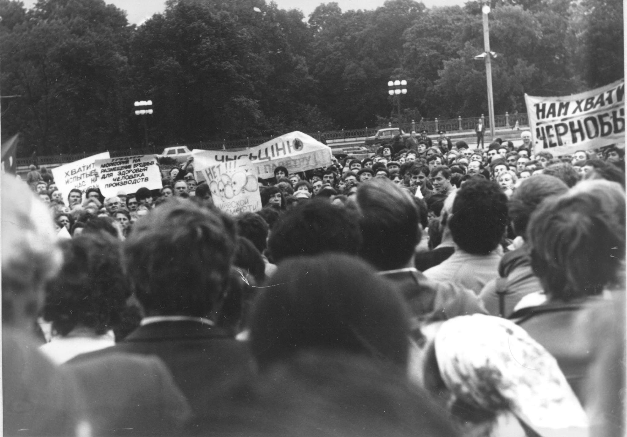 Демократические силы стали выходить в центр города еще за несколько месяцев до распада Советского союза. Все согласовывалось по закону: подавали заявку в горисполком и получали разрешение. Лозунгом одного из таких митингов было: “Камуністычная прыватызацыя рабуе наш народ”.