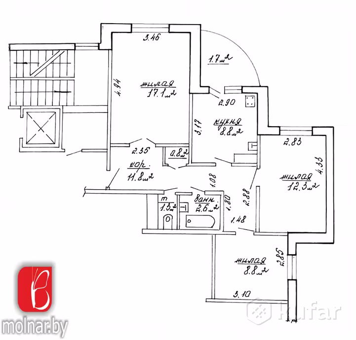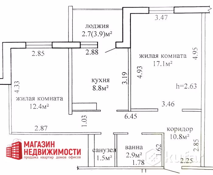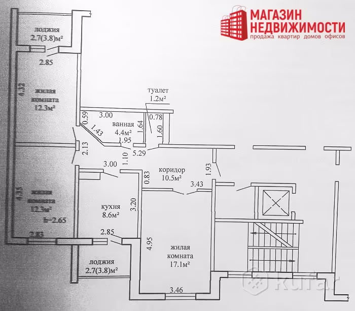 Комната 12,3 кв.м., балкон на кухне. На второй половине проживает семья из трех человек и собака. Фото в объявлении нет.