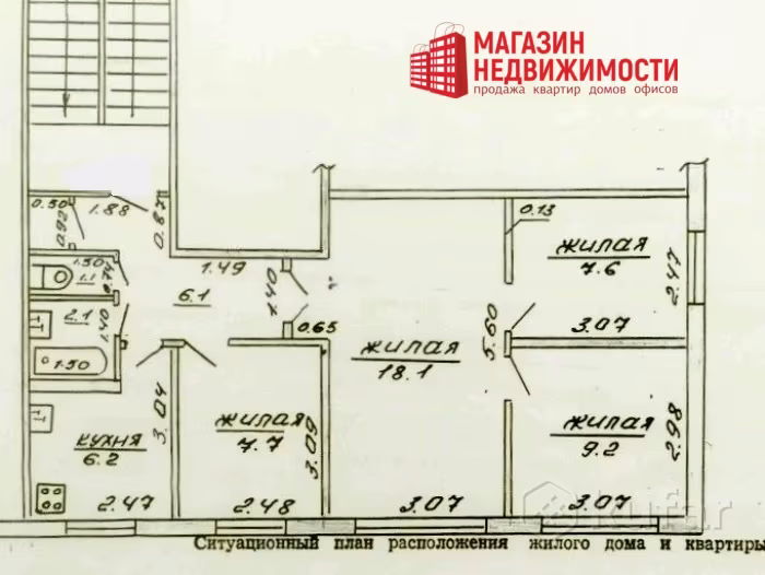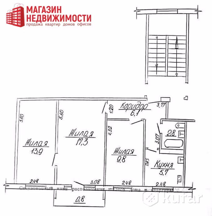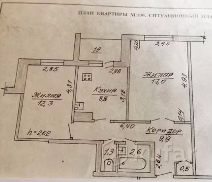 1/6 доли в двухкомнатной квартире. Продаваемая площадь — 7,4 кв.м. Так как на схеме указано, что в квартире есть две комнаты площадью 13,9 и 17,2 кв.м., предполагаем, что продается часть одной из комнат.