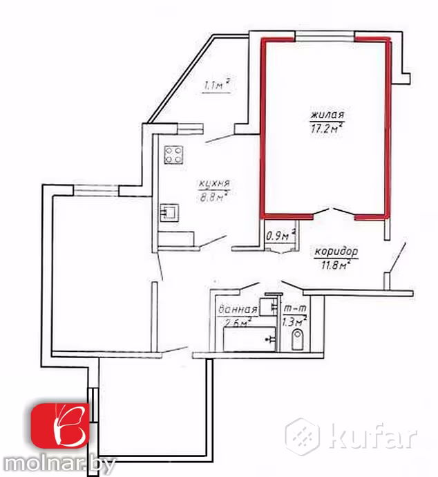 В долю входит одна большая жилая комната площадью 17,1 кв.м. Кухня, коридор, туалет и ванная комната в общем пользовании.