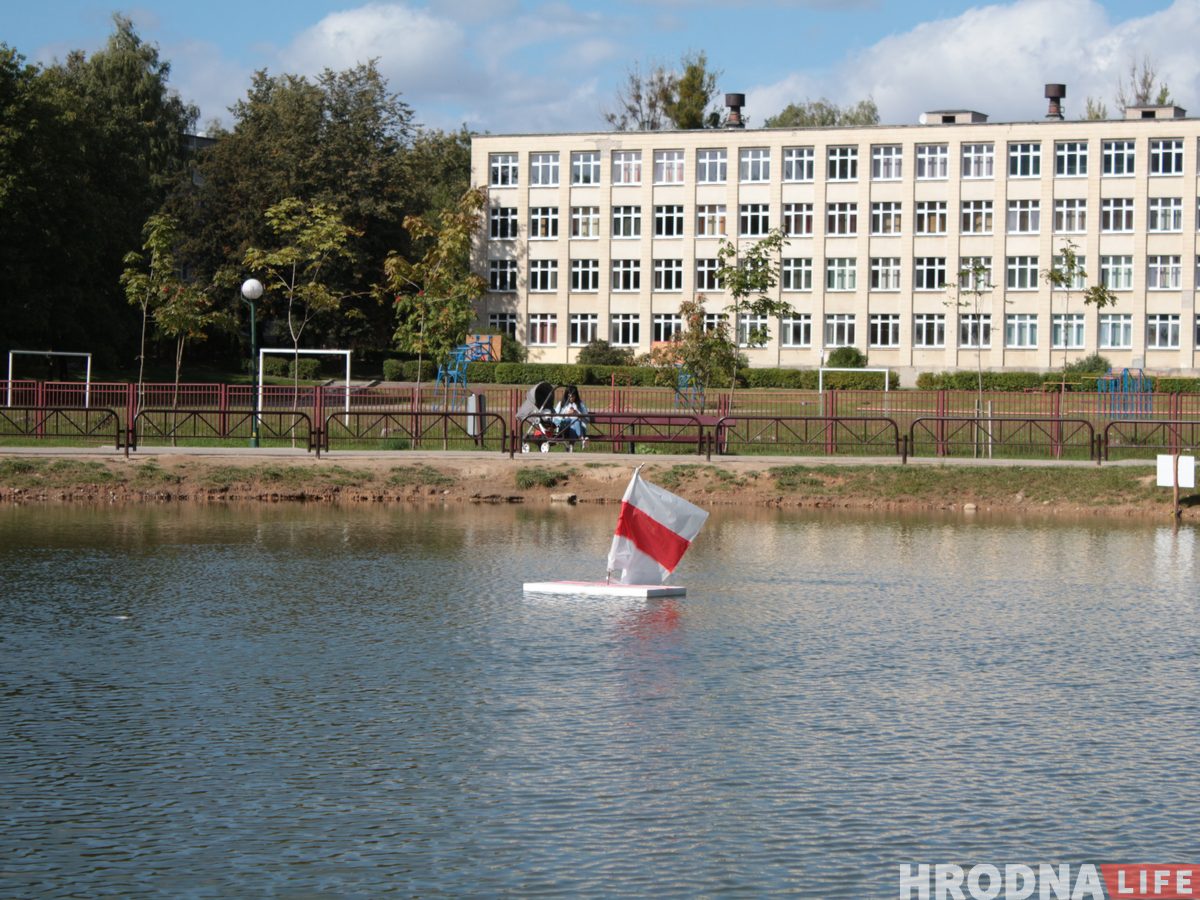 13 сентября в сквере Памяти воинов-афганцев по улице Курчатова в Гродно несколько сотрудников МЧС в сопровождении милиции снимали с середины пруда бело-красно-белый флаг. Чтобы его ликвидировать, были задействованы два автомобиля МЧС и машина милиции. «Спасал» флаг из пруда сотрудник в экипировке водолаза, для этого он выплыл в центр пруда на лодке со страховкой. Местные жители собрались посмотреть на операцию.