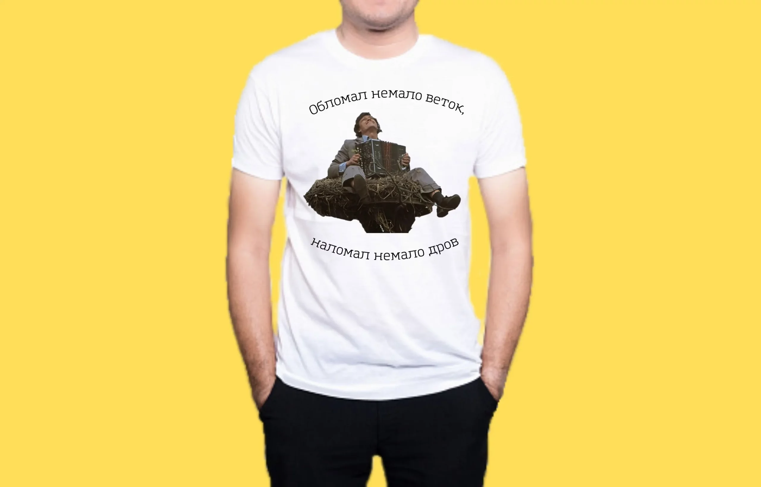 Мерч — часть маркетинга любого современного фильма. Логотипы и изображения героев наносят на одежду, посуду, сувениры, рюкзаки. Ваську из фильма “Белые росы” мы нанесли на кружки. Его отца Федоса — на майку. Главный герой фильма “Меня зовут Арлекино” оказался на свитшоте. В любом случае мы сопровождали героев цитатами из фильмов. Вспомнили мы также о ленте “Я родом из детства” с Высоцким и постсоветский “Кооператив Политбюро”.