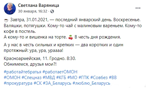 С тех пор ситуация с COVID-19 в Гродно не улучшилась. Однако массовые мероприятия проходят. Саранчуков обратил внимание на пикеты провластных активистов на улице Красноармейской. Около двух десятков человек собираются каждое воскресенье с флагами возле воинской части 5520. Одним из организаторов акций стала активистка «Белой Руси» Светлана Варяница. На ее странице в Facebook с призывом к массовому мероприятию, Вадим Саранчуков и задал вопрос.
