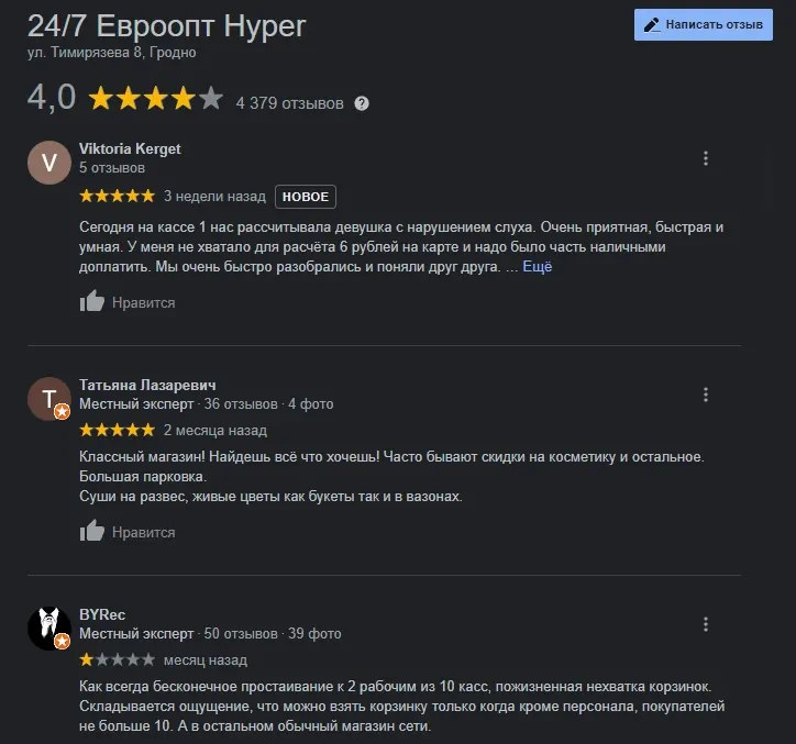 Самый известный и крупный “ночник” в Гродно – «Евроопт» по ул. Тимирязева, 8. Это единственный ночной гипермаркет в городе. Здесь круглые сутки можно купить все, что угодно: от мелкой бытовой техники до куска колбасы и булочки. Отзывы про этот магазин в основном хорошие. Здесь даже есть туалет, который работает и ночью. А где еще можно облегчиться в центре города — читайте в нашем WC-гайде.