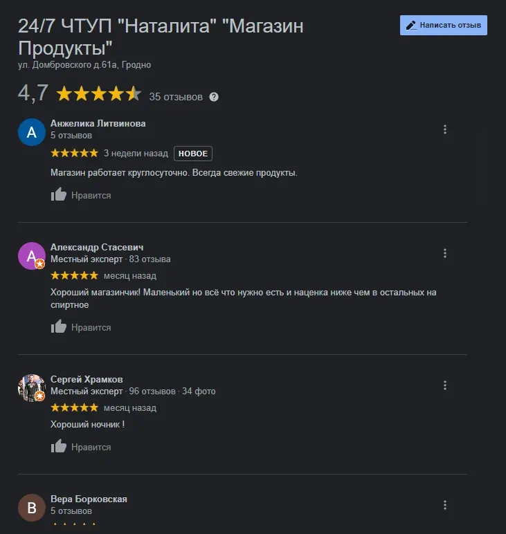 Не далеко от «Наталиты» находится еще один «ночник». В помещении бывшего спортивного бара по ул. Врублевского, 45 разместился магазин «Продукты 24/7». Но отзывы подсказывают, что магазин больше нацелен на алкогольную продукцию, чем на еду и напитки.