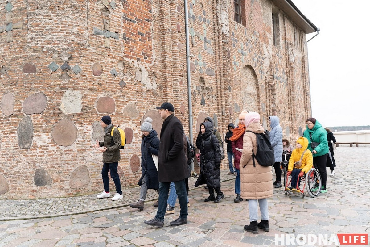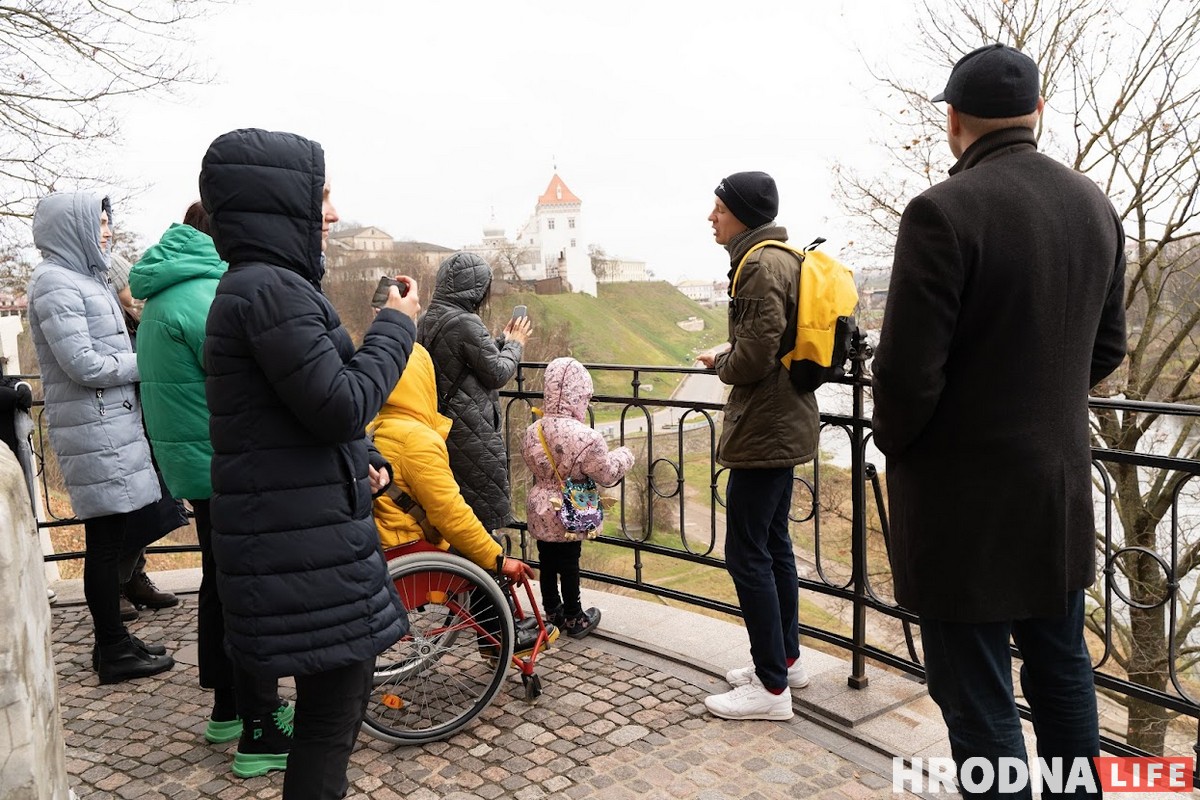 На прогулку по городу вместе с ребятами с инвалидностью пригласили и горожан. Провести группу по городу предложили Александру Перегудову. Он историк и преподаёт в школе. Его часто просят рассказать про город приезжие друзья и знакомые. “Такую группу [в которой были люди с инвалидностью] вёл впервые, — рассказал Hrodna.life Александр. — Не ожидал, что будет так непросто”.