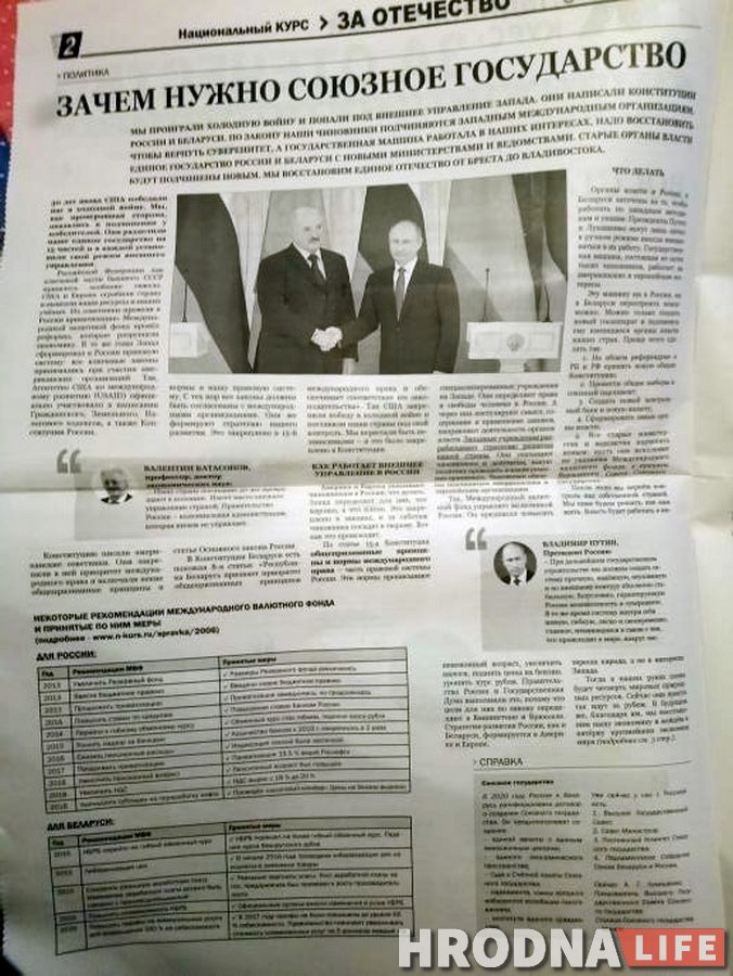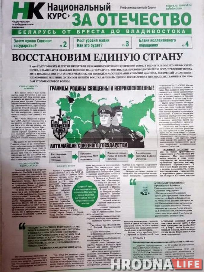 Читатели Hrodna.life присылают в редакцию фотографии газеты «Национальный курс», которую в октябре бросают в почтовые ящики гродненцев. Газета посвящена потенциальному объединению Беларуси и России. Один из распространителей — московский активист Национально-освободительного движения (НОД) Михаил Корнеев, который регулярно приезжает в Беларусь. Он считает, что выжить наша страна сможет только в союзе с Россией.