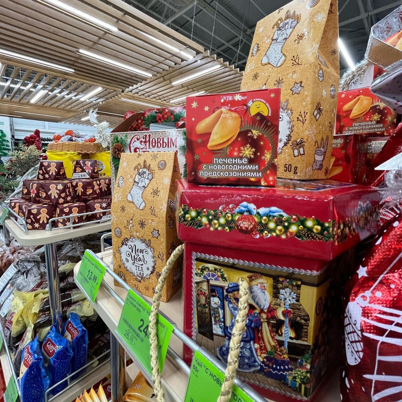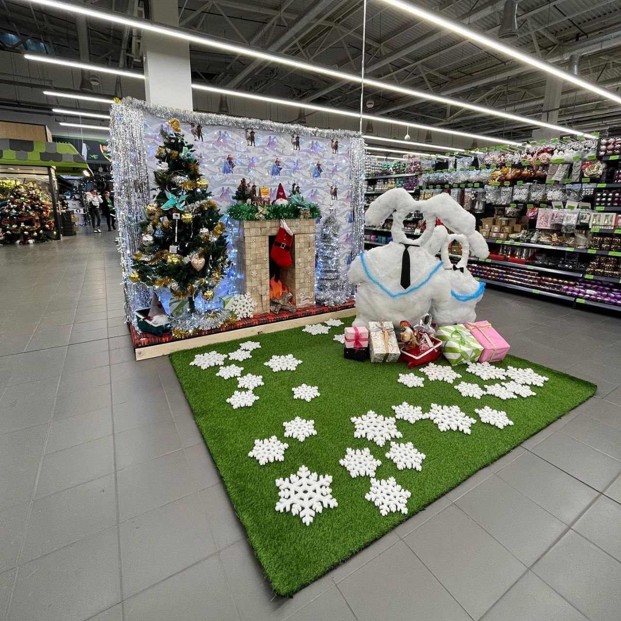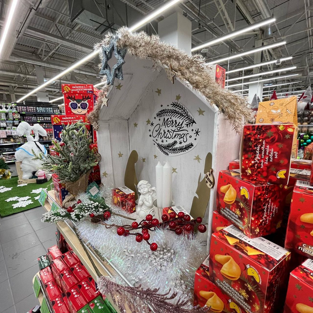 Белые зайцы и мишура в продуктовом