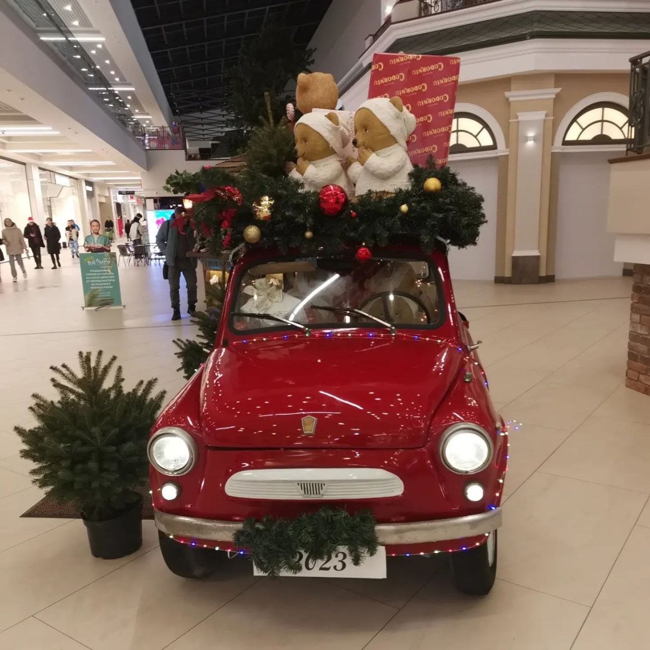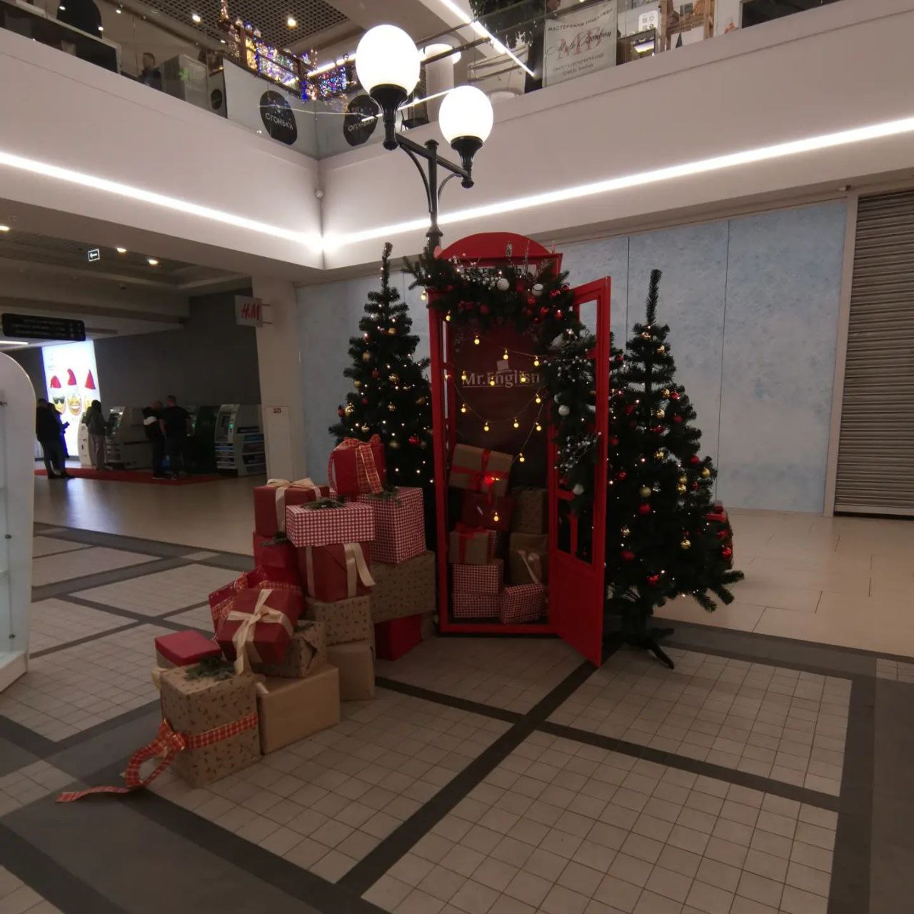 Торговый центр Triniti украсили, как и в прошлом году. На первом этаже стоит большая елка с сугробами и красная машина с медведями и подарками на крыше, под потолком летают золотые совы. Из нового появилась только красная телефонная будка от языковой школы.