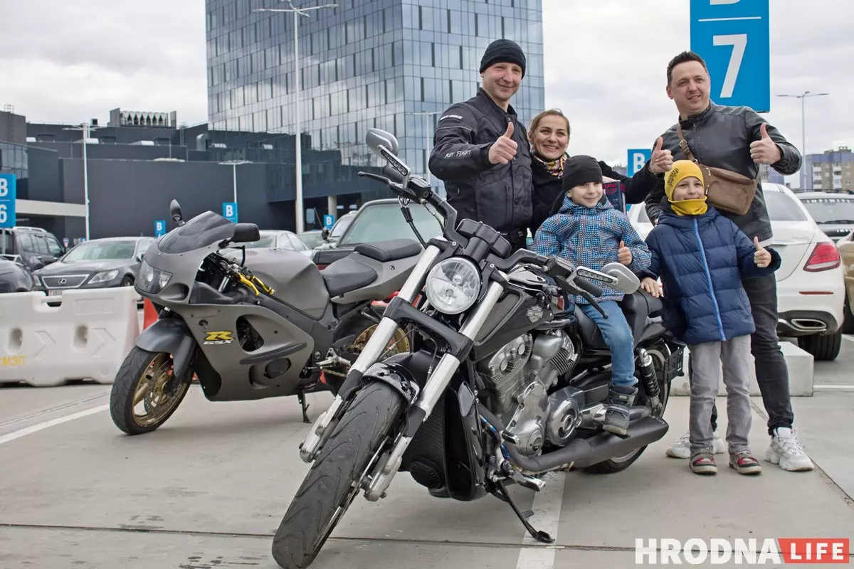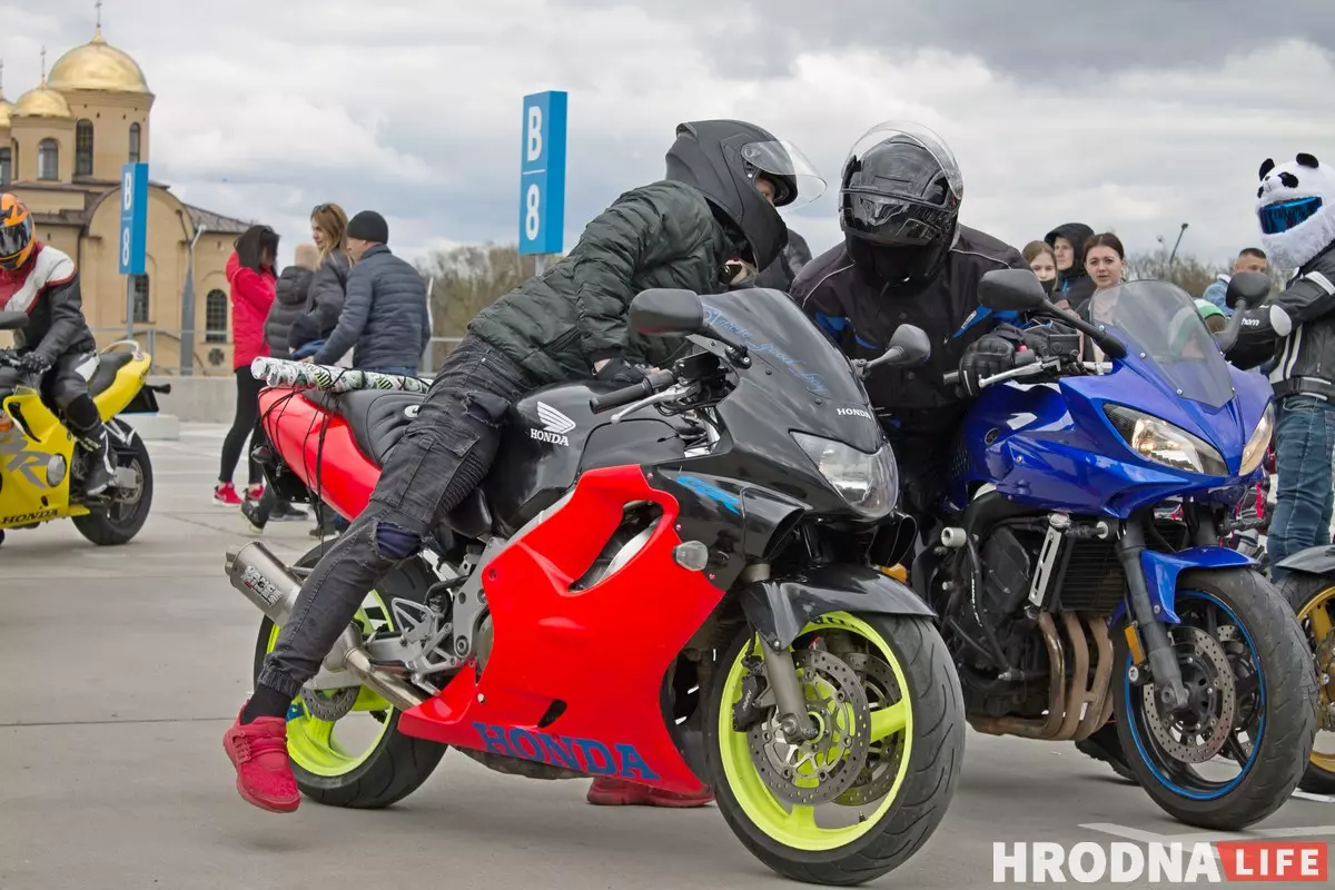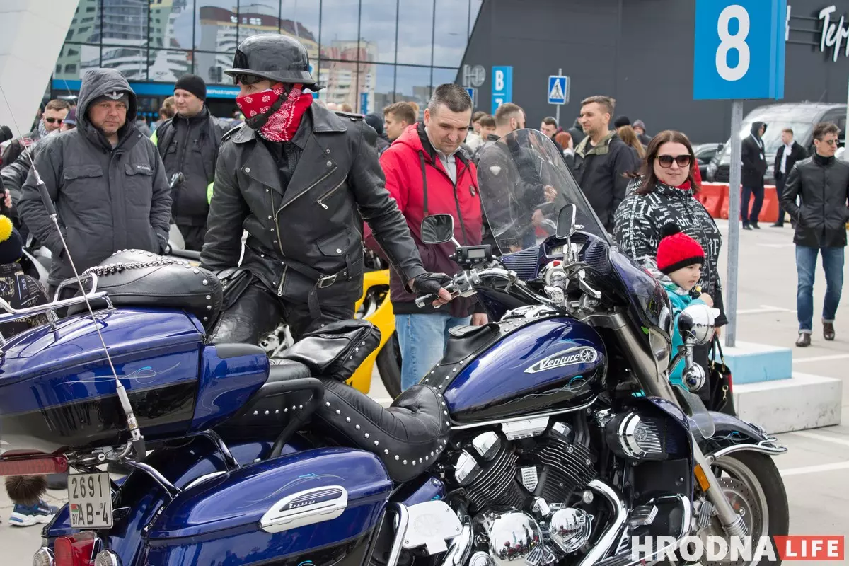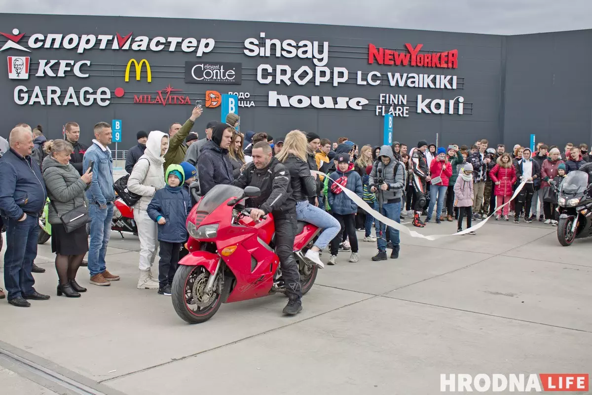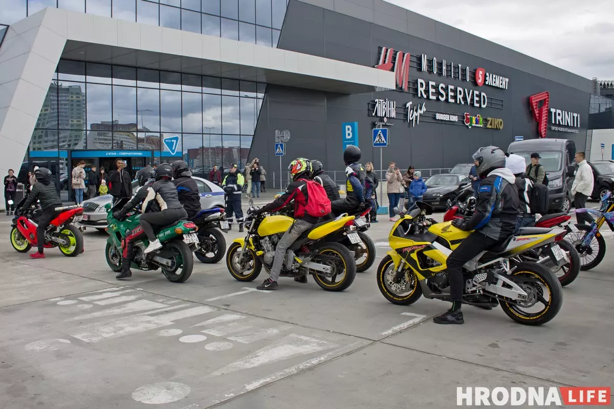 Мотоколонна проехалась по улицам Гродно и финишировала на верхней парковочной площадке ТРК “Тринити”. Здесь байкеров встречали ведущие, диджеи и зрители.