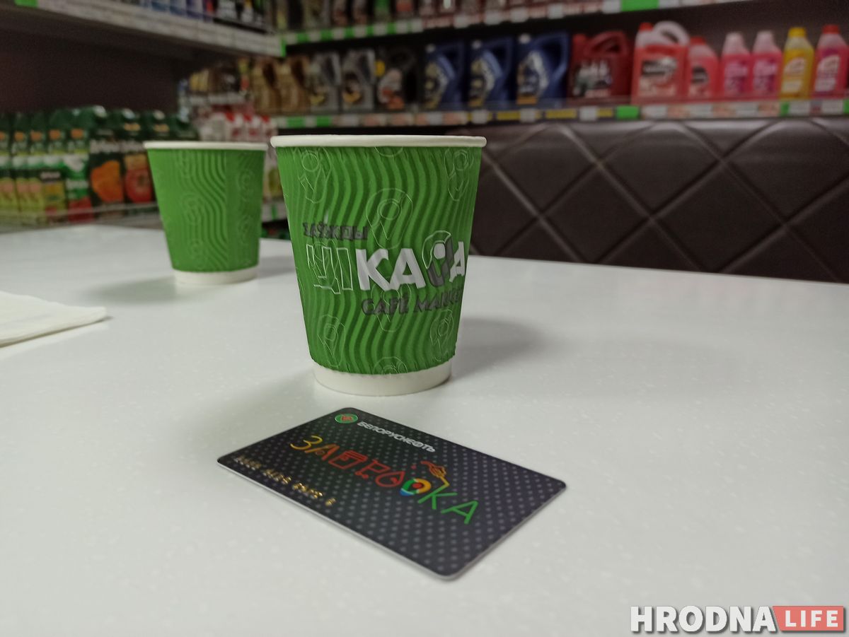 За час падарожжа мы засумавалі па каве. Знайсці яе ў вёсачках і аграгарадках аказалася няпроста. Недзе сталоўкі ці кавярні зачынены з нагоды эпідэмічнай сітуацыі, недзе летам праводзяць рамонт. Але на запраўках “Беларуснафты” кава заўжды ёсць. Можна пад’есці на месцы ці ўзяць каву з сабой.