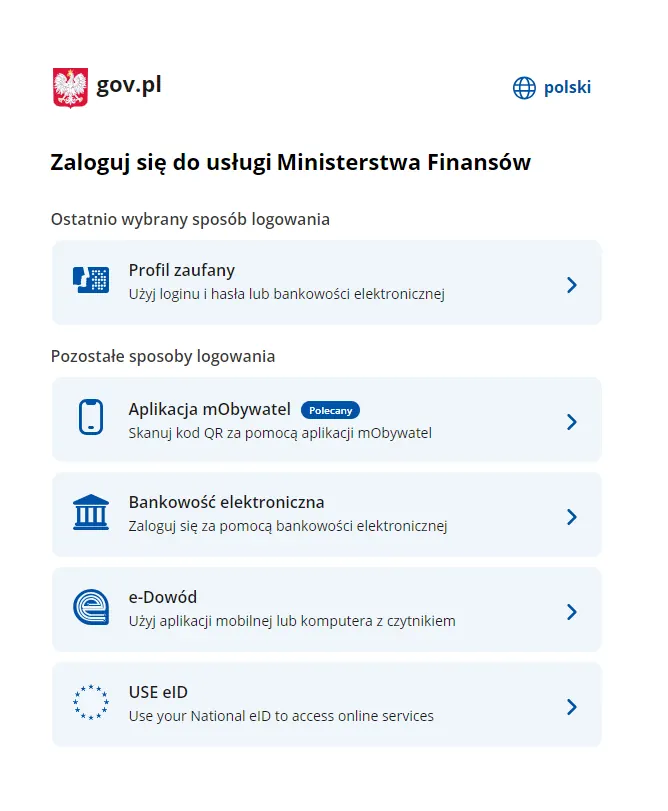 Электронные декларации можно подать на сайте podatki.gov.pl. Вам нужно нажать «Sprawdź», затем еще раз «Sprawdź» и кнопку «e-Urząd Skarbowy — zaloguj się». Обычно для входа используется «profil zaufany» или ваш интернет-банкинг.