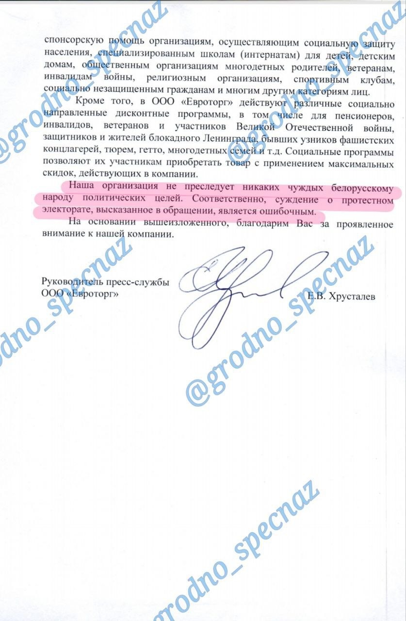 “Настоящим сообщаем, что ООО “Евроторг” неукоснительно соблюдает законодательство Республики Беларусь, в том числе в области рекламы и культуры. Руководство ООО «Евроторг» разделяет общепринятые в Республике Беларусь культурно-нравственные ценности белорусского народа. ООО «Евроторг» является социально-ориентированной организацией розничной торговли, основной задачей которой является удовлетворение спроса населения на потребительские товары”, — написали в ответе, который пришел Бондаревой.