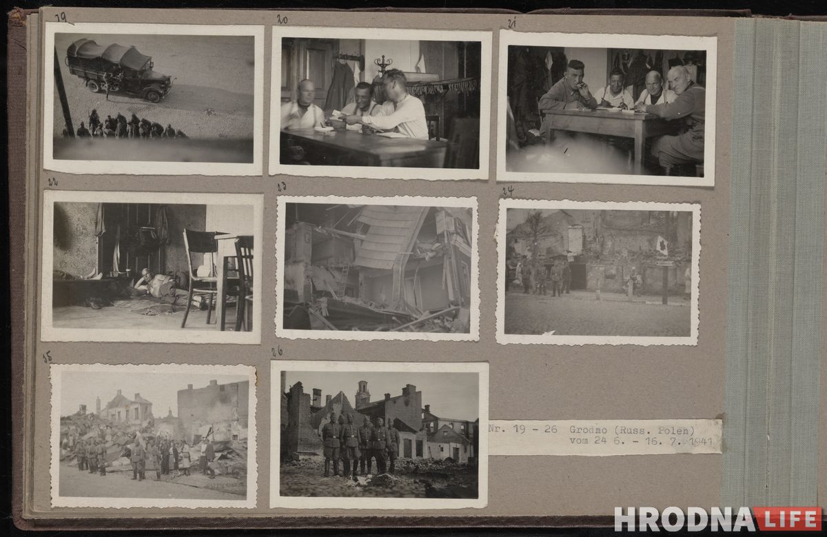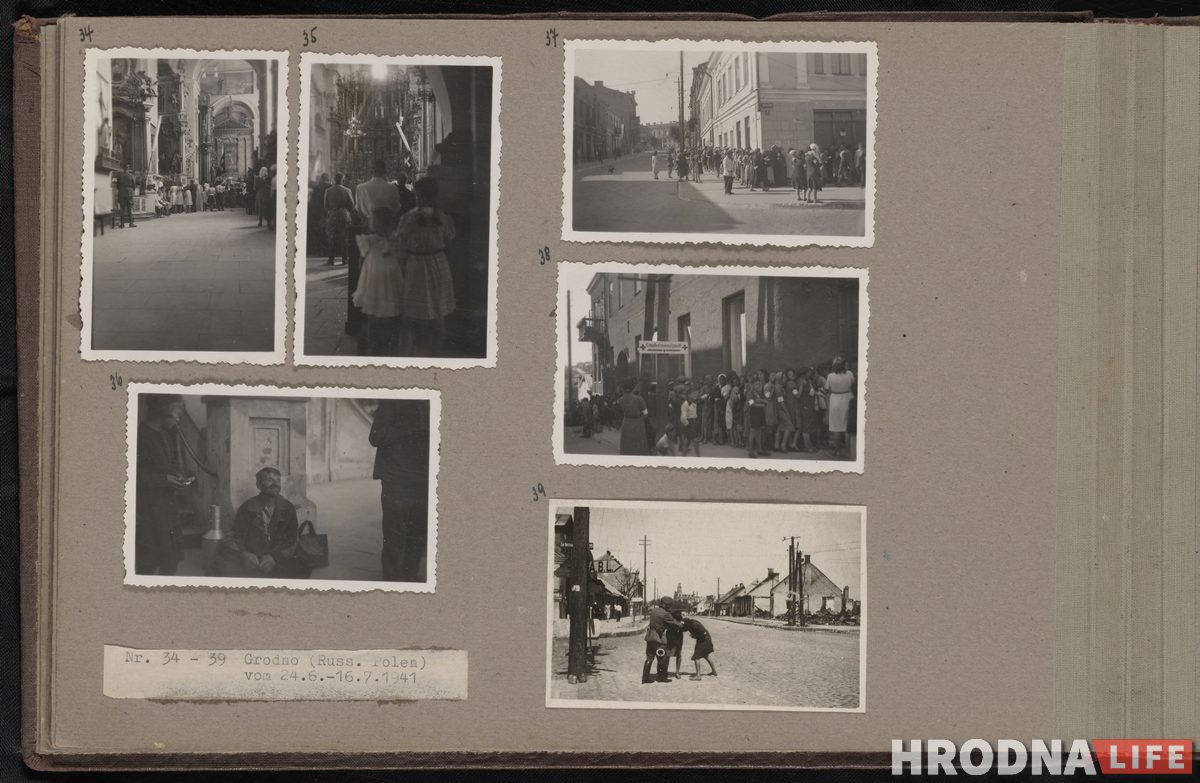 В альбоме есть фотографии из Гродно, сделанные в июле 1941 года. На снимках можно увидеть немецких солдат среди руин Гродно, гражданских лиц, посещающих церковную службу, группу еврейских мужчин и женщин с повязками на рукавах, стоящих в очереди, и немецкого солдата, арестовывающего двух евреек.