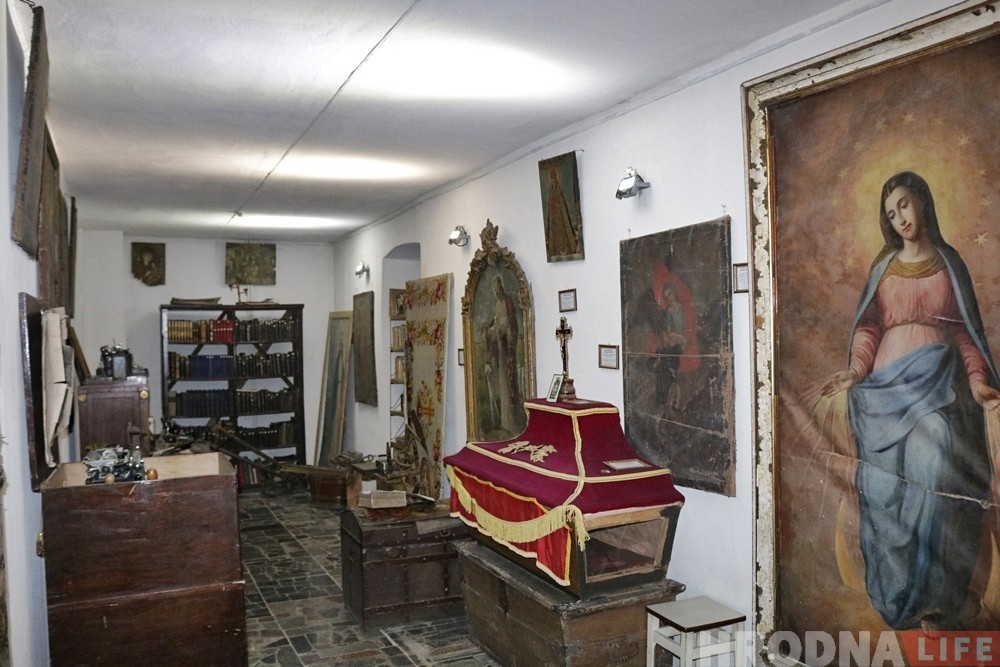 «В этих подвалах была усыпальница основателей монастыря монахинь-бригиток, а сегодня тут музей в котором около 200 экспонатов, — рассказывает настоятель костёла Антоний Гремза. — Многие из них чудом удалось сохранить благодаря сестрам-назаретянкам, которые были последними, кто жил в монастыре. Когда в советские годы костёл закрывали многие ценные вещи монахиням удалось перевезти в Бернардинский костел. Обратно всё вернули только в 90-х годах. В самом же костёле нашли портреты Веселовских [семья, пожертвовавшая деньги на основание монастыря — ред.] и архивы«.