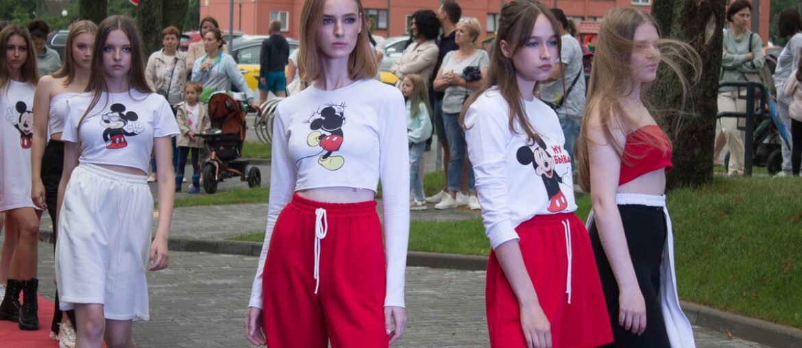 Следующий выход моделей – в одежде от дизайнерки Юлии Траскевич. Первая её коллекция, «Микки» посвящена любимому герою мультфильма из детства. Большая часть одежды в этой коллекции из хлопка и трикотажа.